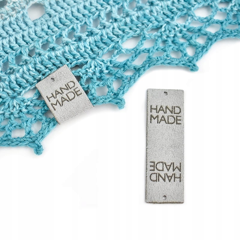 Ярлик з нубуку з написом "HAND MADE". Має два отвори для шиття.