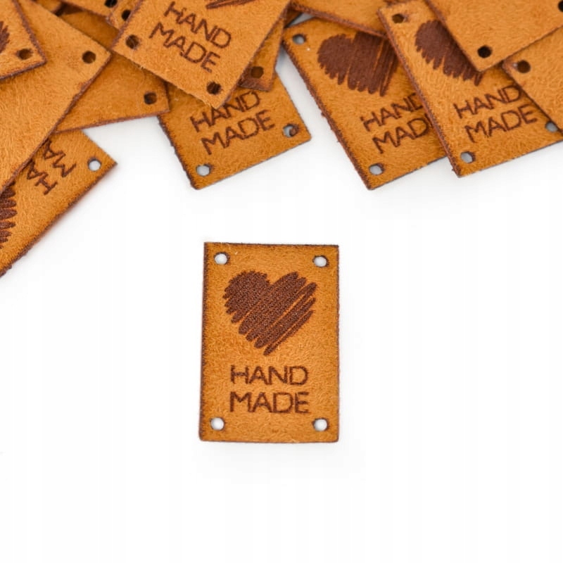 Етикетка з нубуку з написом "Handmade" та ескізом серця та чотирьох отворів для пришивання.