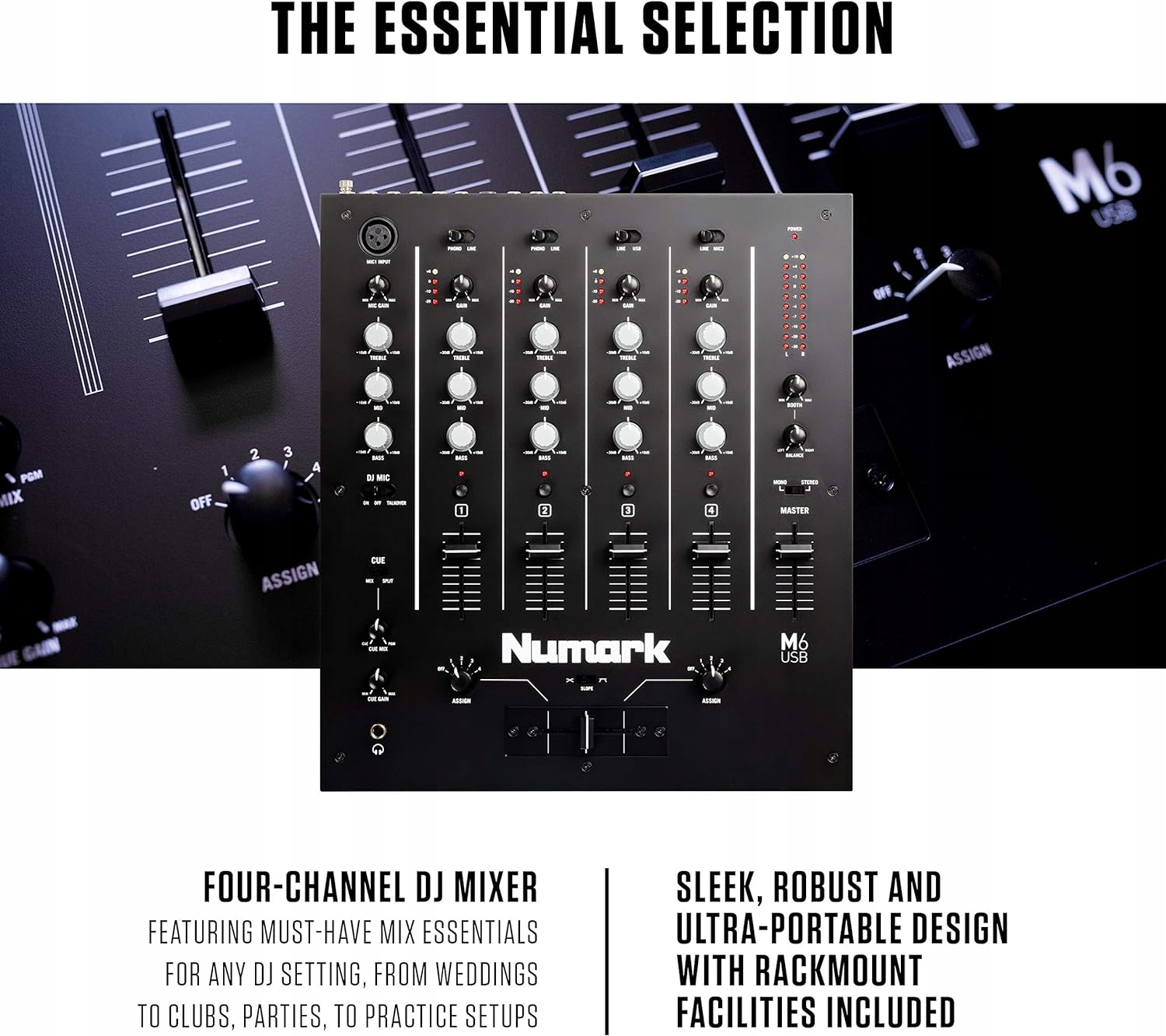 M6 USB — чотириканальний мікшер Numark. Клубний стиль цього мікшера забезпечує безперебійну роботу з будь-яким стандартним джерелом звуку, а також має USB-порт для підключення до комп’ютера. M6 USB — це пристрій, що підключається і працює, що робить непотрібними будь-які додаткові драйвери, а сам мікшер дозволяє негайно завантажувати мікс на комп’ютер або відтворювати музику з жорсткого диска.