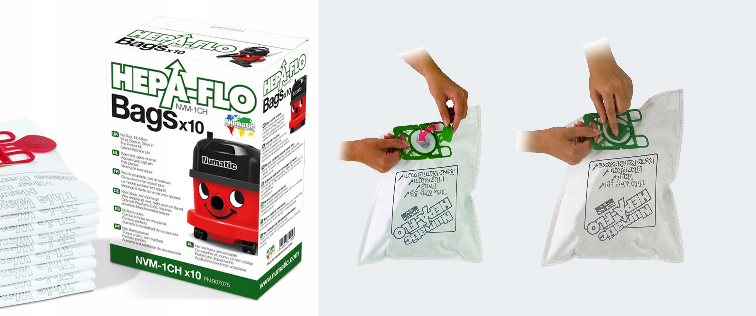 Лабораторні випробування показали, що використання мішків Hepa-Flo® підвищує ефективність фільтрації найдрібніших частинок пилу (менше 0,3 мікрометра в діаметрі) більш ніж на 50%. Це суттєво сприятиме ще більш ефективній боротьбі з пилом і покращить якість повітря приміщень, які прибираються пилососами Numatic.