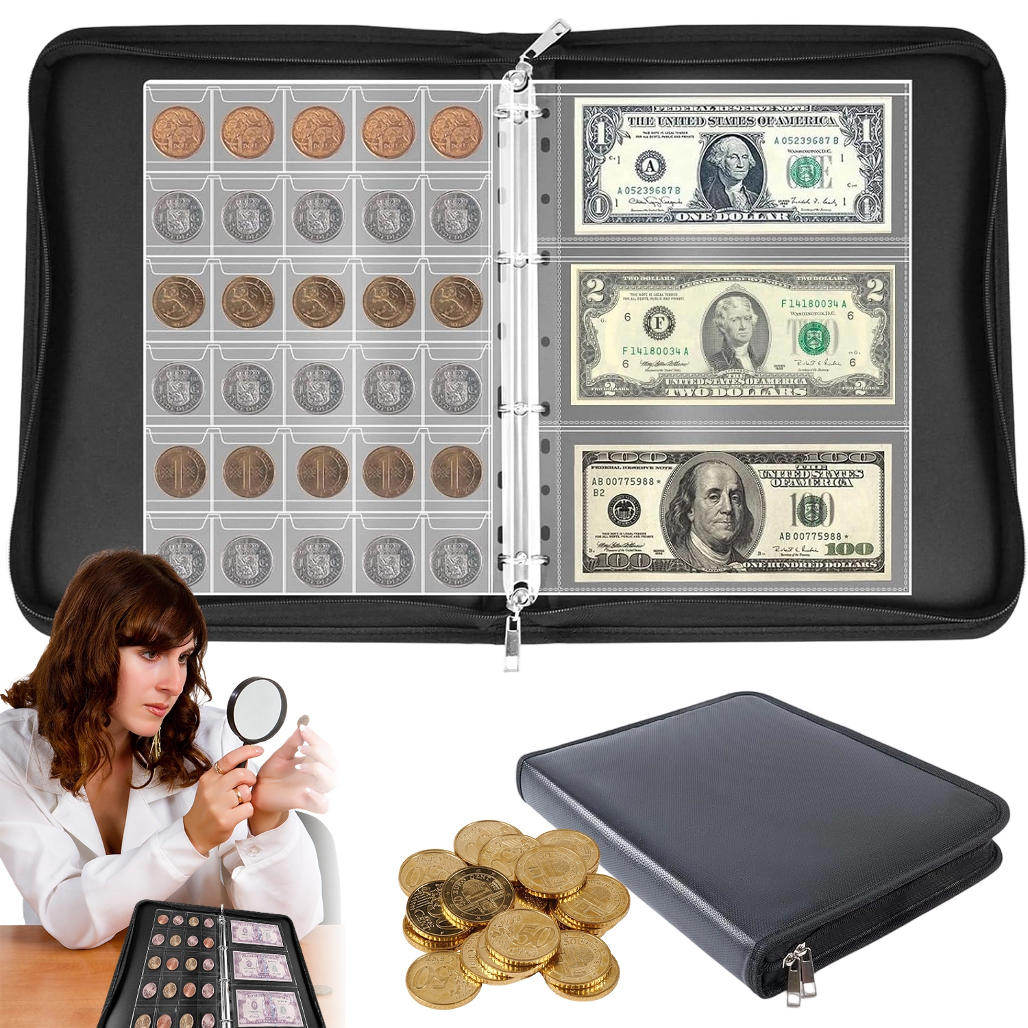 🪙 Вогнетривкий альбом для монет на 2 євро, альбом для монет на 24 сторінки, альбом для колекції монет із 300 монетами та 36 банкнотами в євро, доларах, фунтах стерлінгів, пенсах (чорних)