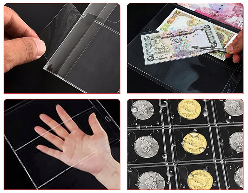 - Сторінки альбому для колекціонування монет зроблені з дуже прозорого матеріалу, тож ви можете легко переглядати свою колекцію, не виймаючи її, одночасно ефективно запобігаючи пошкодженню ваших речей.