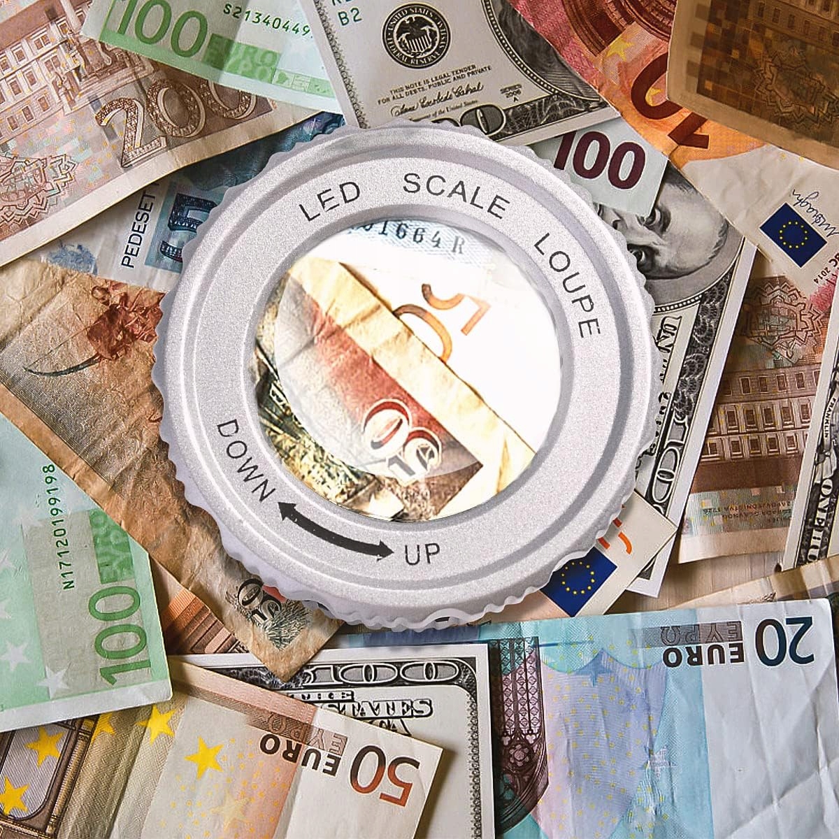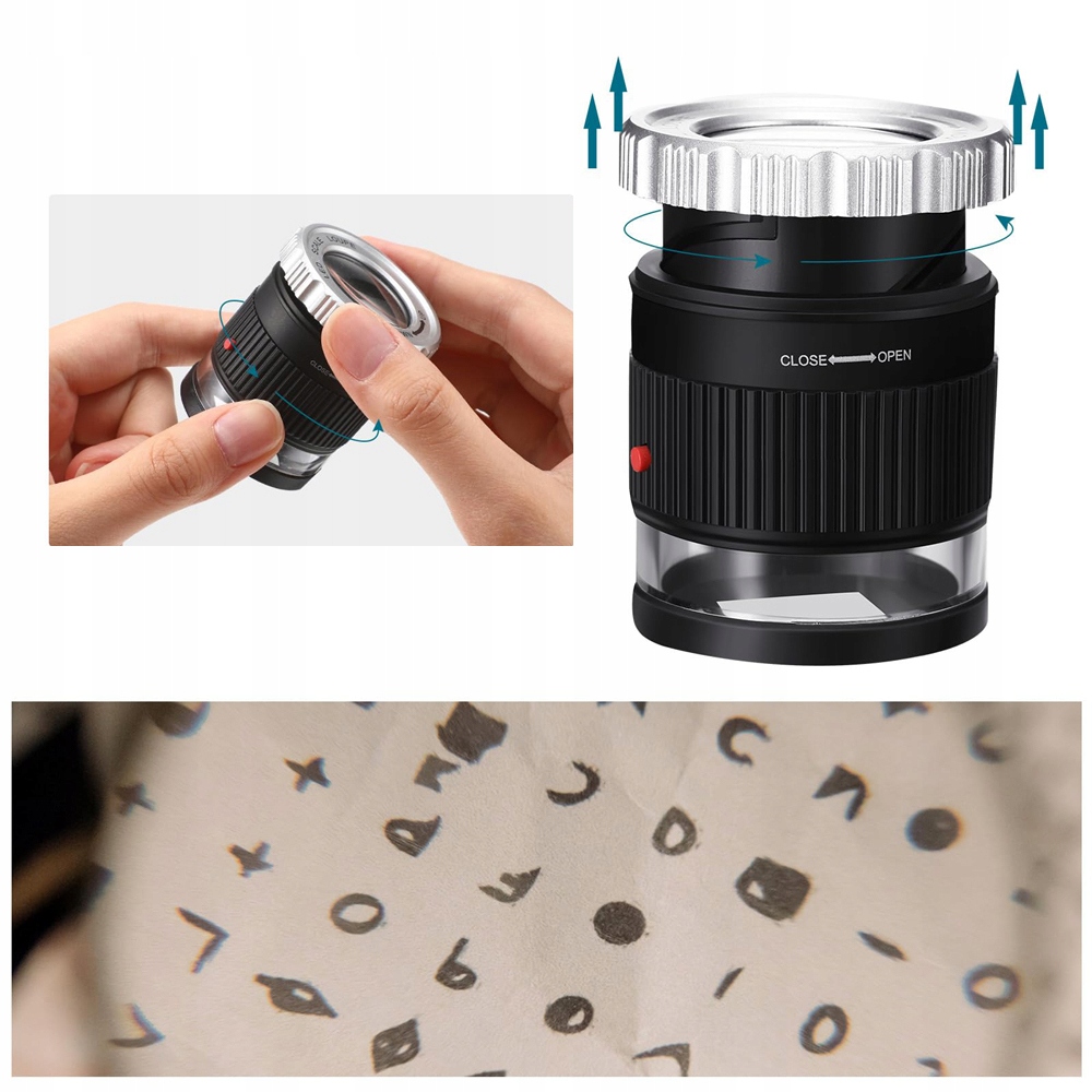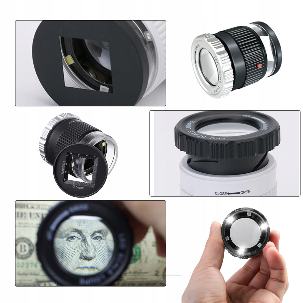 ✅- Оснащена 3 світлодіодами та 3 УФ-лампами, лупа підходить для використання в темних умовах, а УФ-лампи використовуються для перевірки автентичності. Просто натисніть червону кнопку збоку, щоб увімкнути 3 білі світлодіоди, натисніть вдруге, щоб увімкнути 3 УФ-світлодіоди, і натисніть третій раз, щоб вимкнути їх.