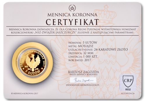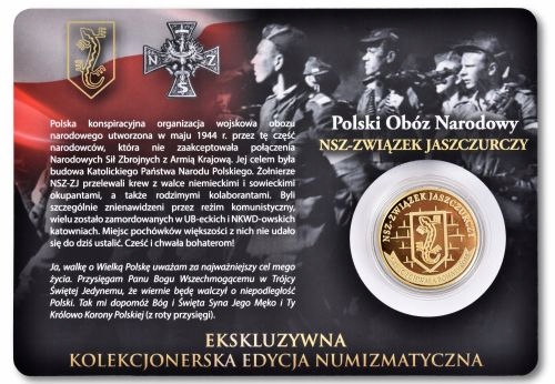Перша в історії нумізматична монета на честь героїв-вояків під прапором: NSZ-ZWIEK JASZCZURCZY, польської військової організації національного табору, створеної в травні 1944 року, зараз у продажу. Ця вкрита золотом монета має підпис Corona Regni Poloniae. На її реверсі ми розмістили символ Lizard Association у стилі муралу. Під «Ящіркою» декоративна стрічка з написом: ГЕРОЯМ ЧЕСТЬ І СЛАВА! Кожна монета поміщена в прозорий ковпачок та ілюстрований блістер, невід’ємною частиною якого є авторизуюча голограма, що містить індивідуальний нумізматичний номер.