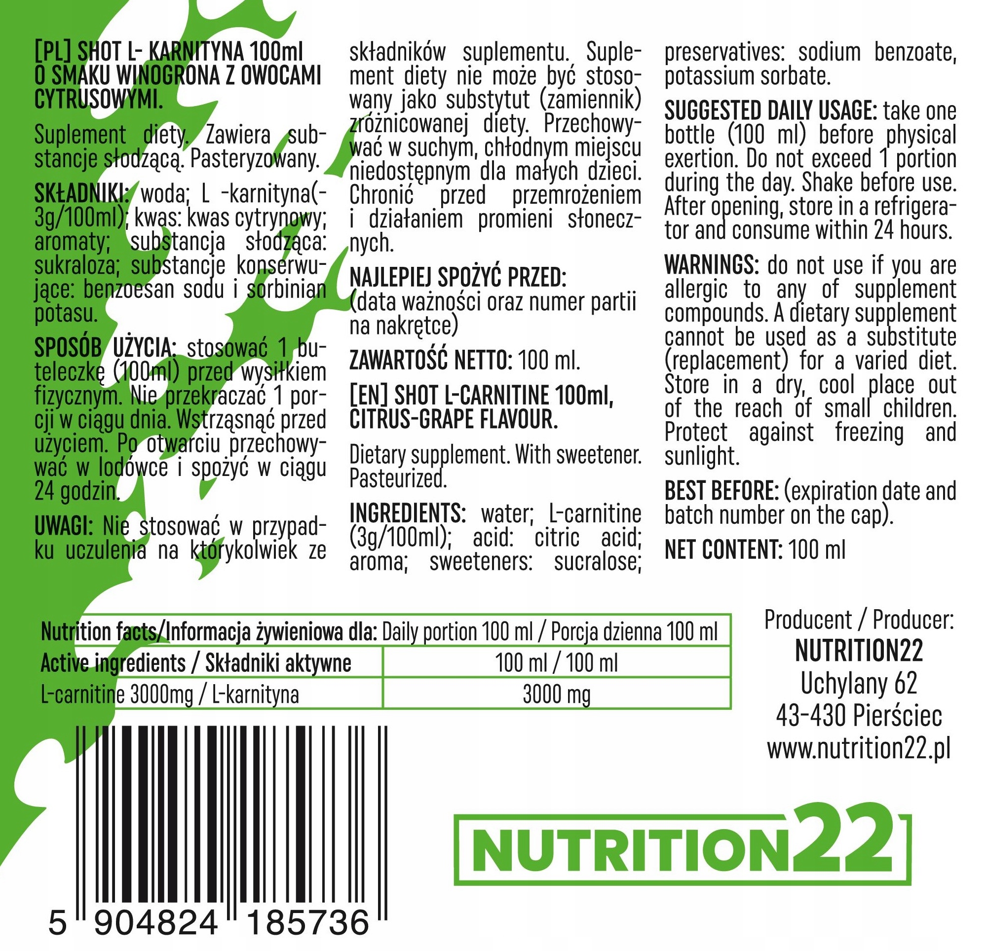 Nutrition22 L-карнітин 3000 мг жиру пальника постріли на 100 мл