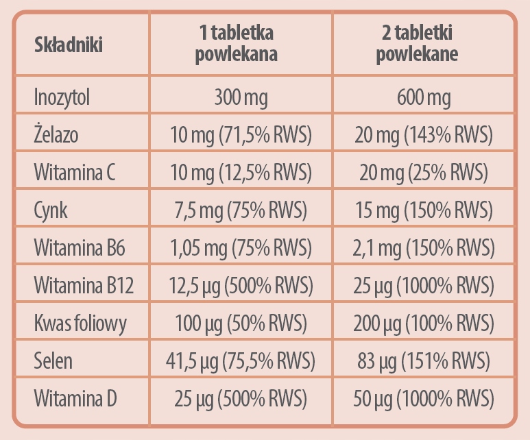інозит; наповнювач: целюлоза мікрокристалічна; заліза(ІІ) бісгліцинат; глюконат цинку; антизлежувач – бавовняна олія; l-аскорбінова кислота (вітамін С); холекальциферол (вітамін D3); L-селенометіонін; глазурувальник: гідроксипропілметилцелюлоза; засіб проти злежування: діоксид кремнію; глазурувальник: полівінілпіролідон; піридоксину гідрохлорид (вітамін В6); глюкозамінова сіль (6S)-5-метилтетрагідрофолієвої кислоти (фолієва кислота); метилкобаламін (вітамін B12)
