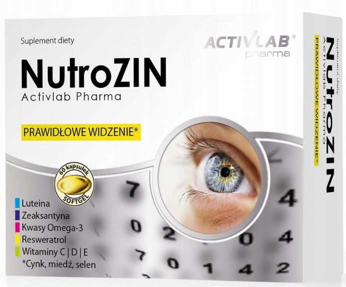NutroZIN Activlab Pharma - це продукт, що містить аж 12 активних речовин: кислоти ОМЕГА 3, EPA, DHA, лютеїн і зеаксантин, ресвератрол, вітаміни C, D, E, мідь, селен і цинк. , що підтримує правильний зір.