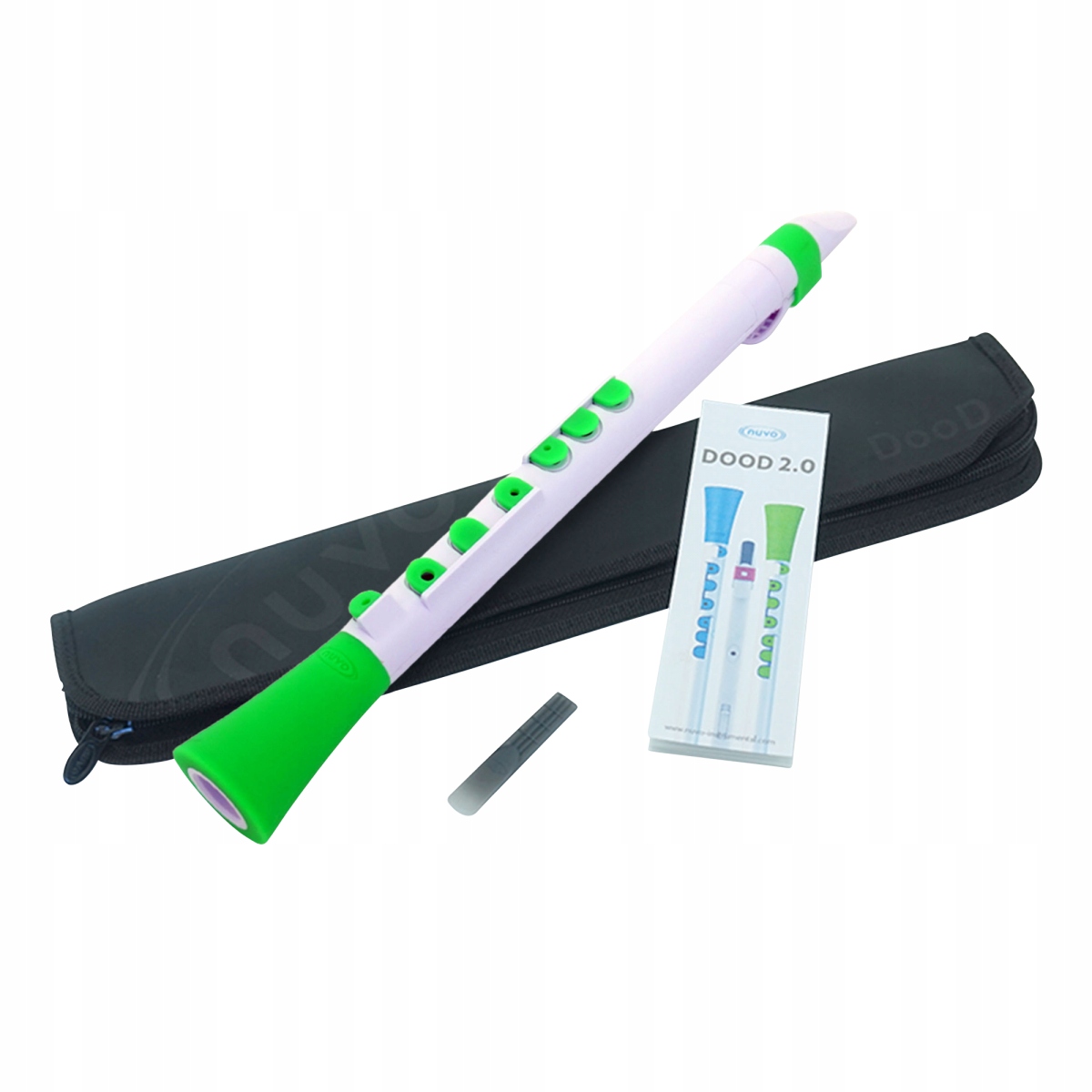 Дуд використовує той самий мундштук і тростину, що й Кларінео. У набір входять дві смоли NUVO, таблиця аплікатури та футляр. Повністю водонепроникний, тому його можна часто мити теплою водою з милом.