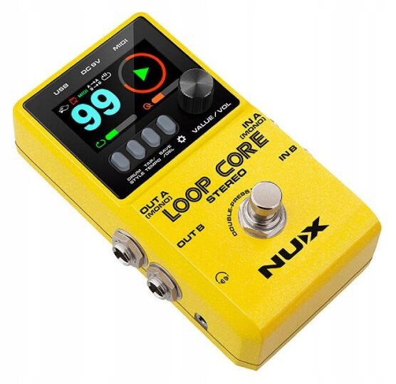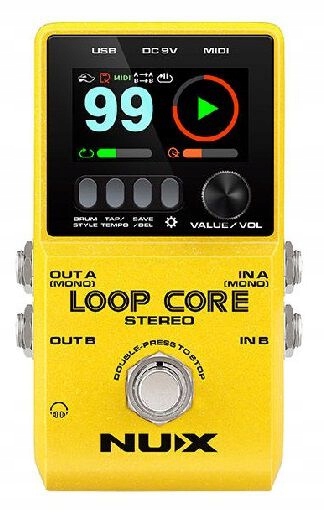 NUX Loop Core Stereo — це лупер нового покоління. Він має високоякісний кольоровий РК-дисплей, стерео входи/виходи та MIDI-вхід. Loop Core Stereo дозволяє створювати до 6 годин і зберігати їх в одному з 99 доступних місць пам'яті та відтворювати як стереопетлі! У ньому також є 50 музичних композицій для барабанів, які зроблять зациклення ще веселішим. Незалежно від того, чи займаєтеся ви, пишете композицію чи виступаєте наживо, ви отримаєте натхнення з першого циклу.