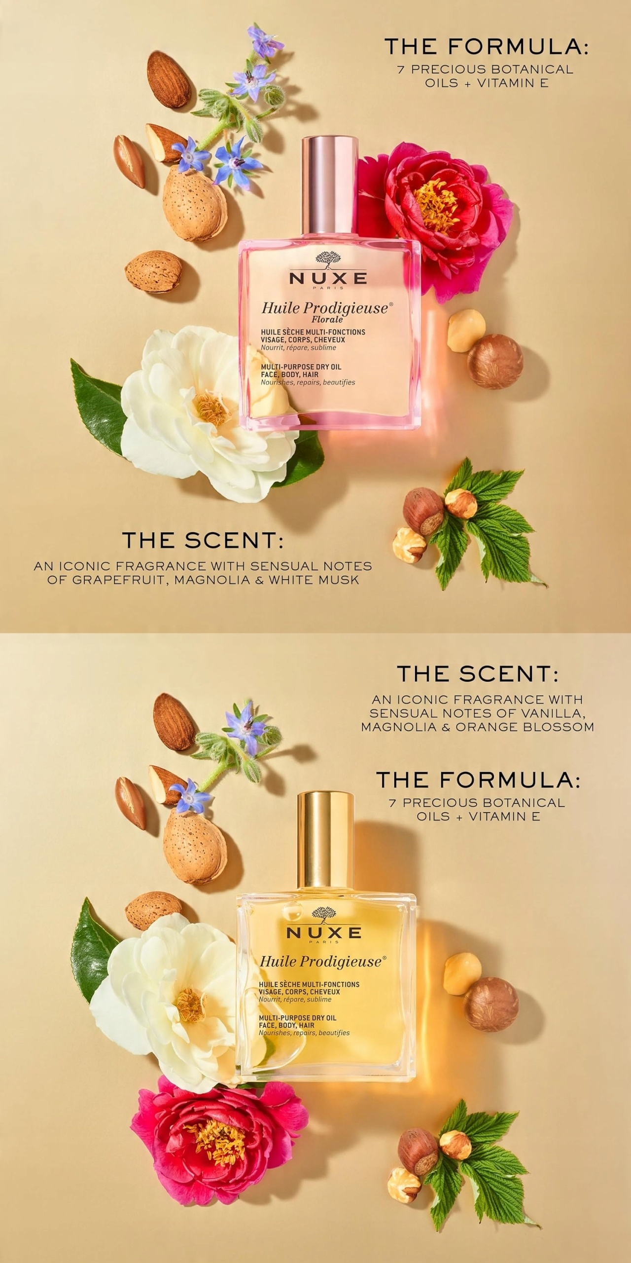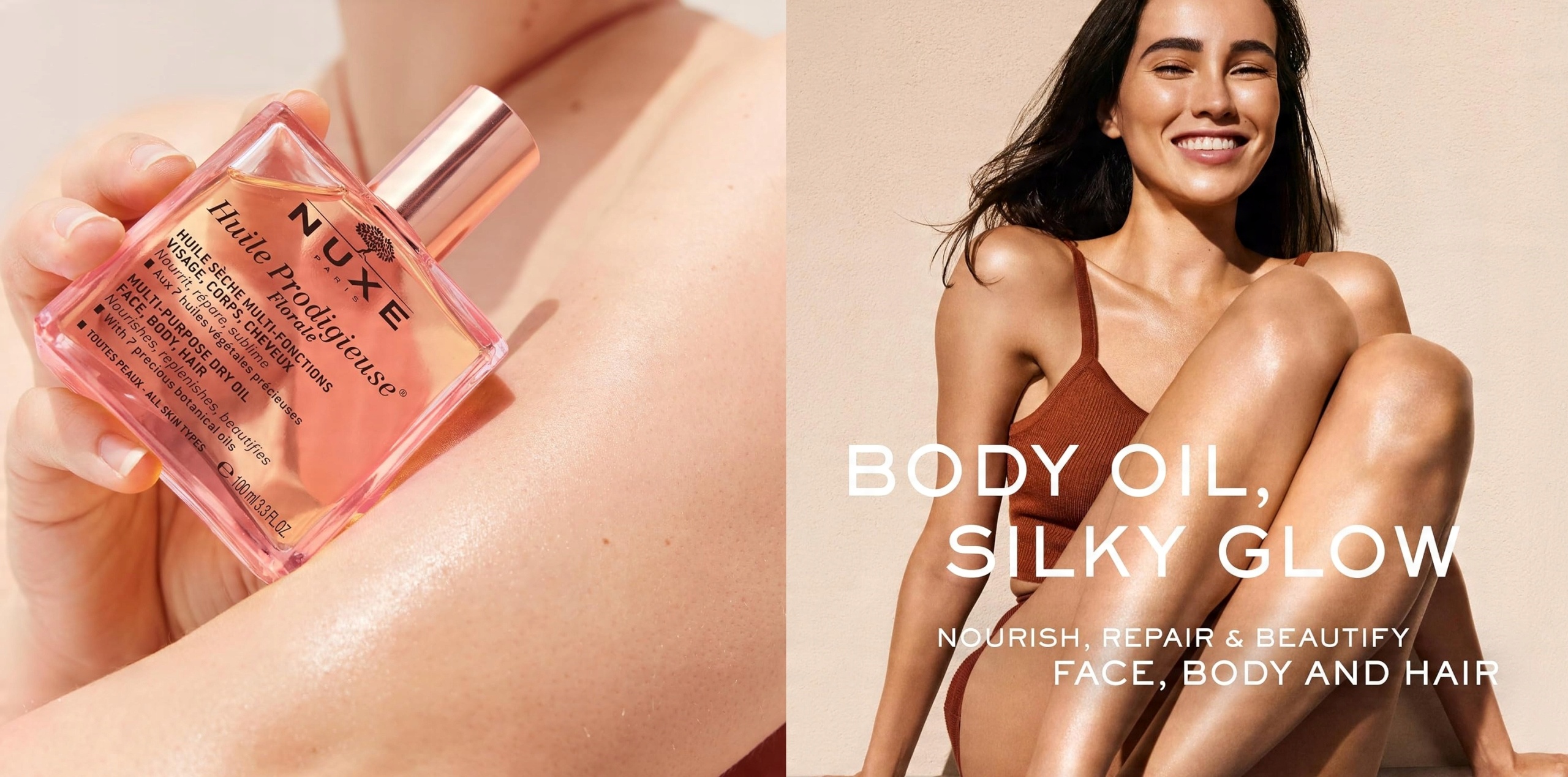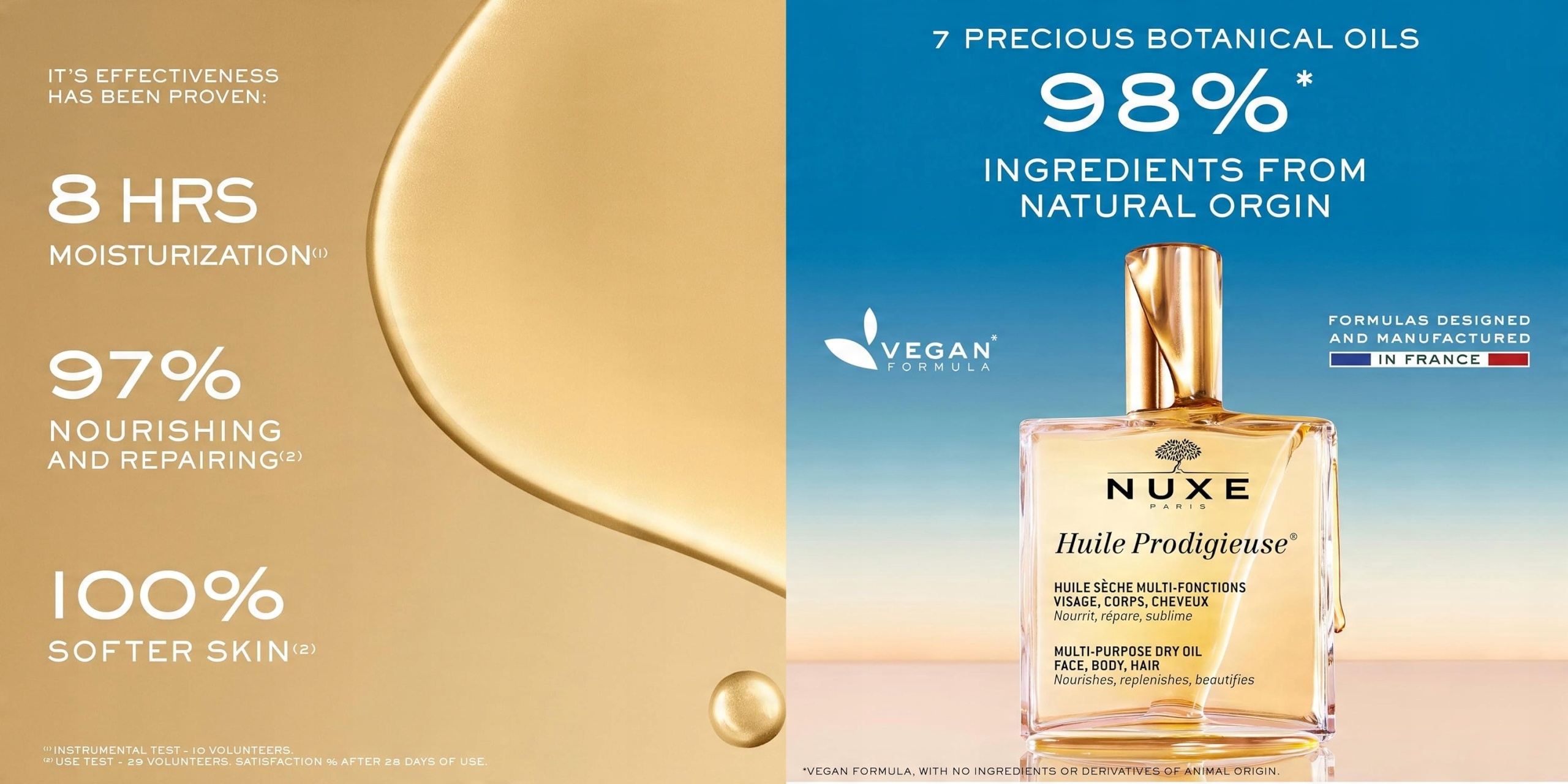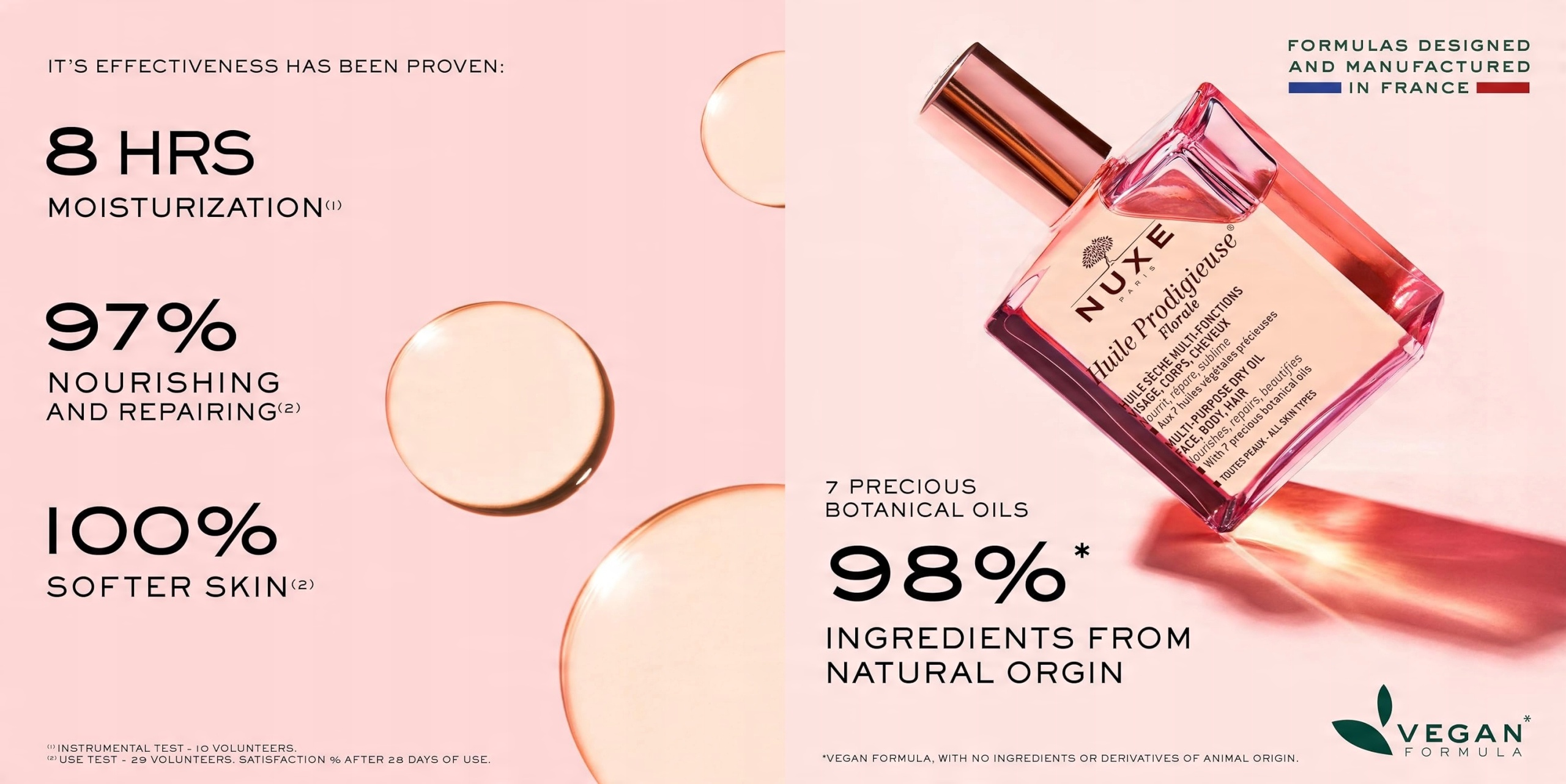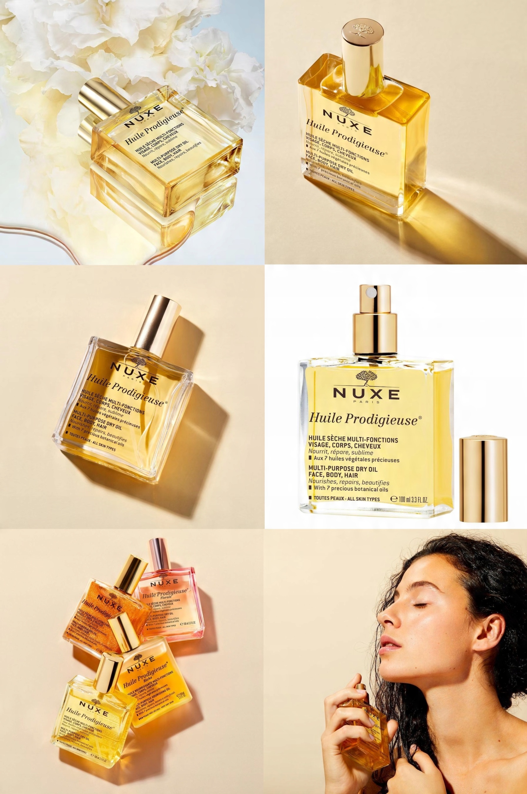 суха олія з багатьма застосуваннями - живить, регенерує та згладжує. Їх використання забезпечило якомога більше радості. Ця комбінація відображається від імені бренду, створеного зі списку слів "природа" та "розкіш", а також у всіх продуктах NUXE.