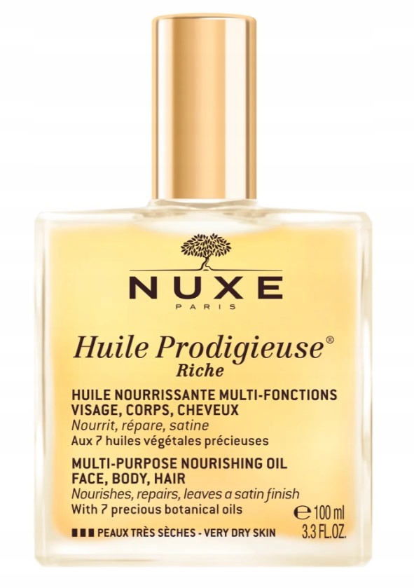 Nuxe Huile Prodigiuse® Riche -це багатофункціональне масло для догляду за шкірою та волоссям. Косметика має регенеруючий, живильний та згладжувальний ефект, надаючи шкірі атласну обробку. Продукт не залишає липкого шару. Натуральні інгредієнти олії, збагачені вітаміном Е, живлять, регенерують і підкреслюють красу шкіри в одному жесті догляду, а волосся приносять м'якість і блиск. Використовується для волосся, це робить їх живлячими, зволоженими та відновлює сяйво. Багатий рецепт містить 98,1% натуральних інгредієнтів.