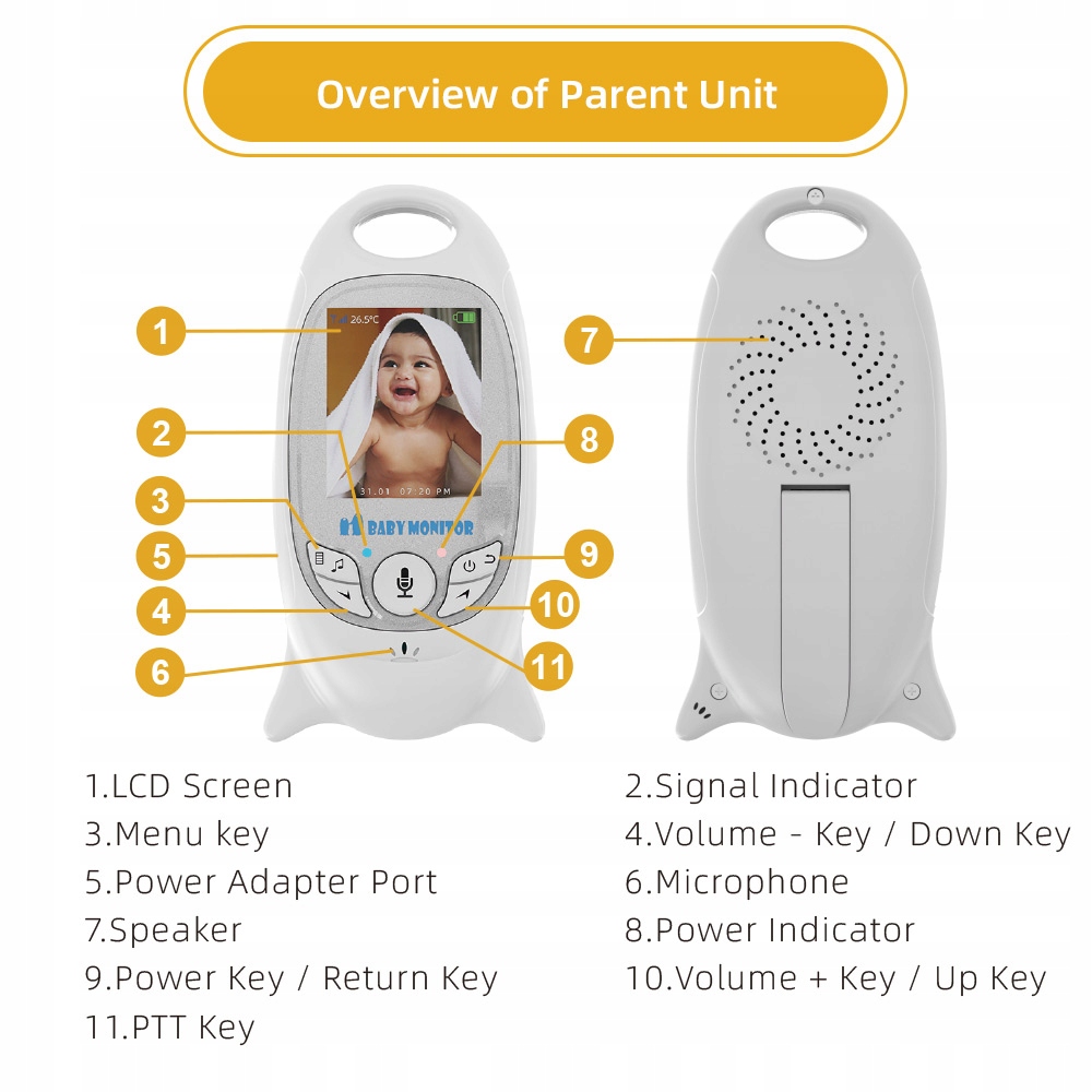 Два -дюймовий дисплей кольору надсилає на екрані дитини. Бездротове з'єднання знаходиться в приміщеннях 50 метрів (без стін, без підлоги) і на 260 метрів зовні (без стін, без інших сигналів та магнітного поля).
