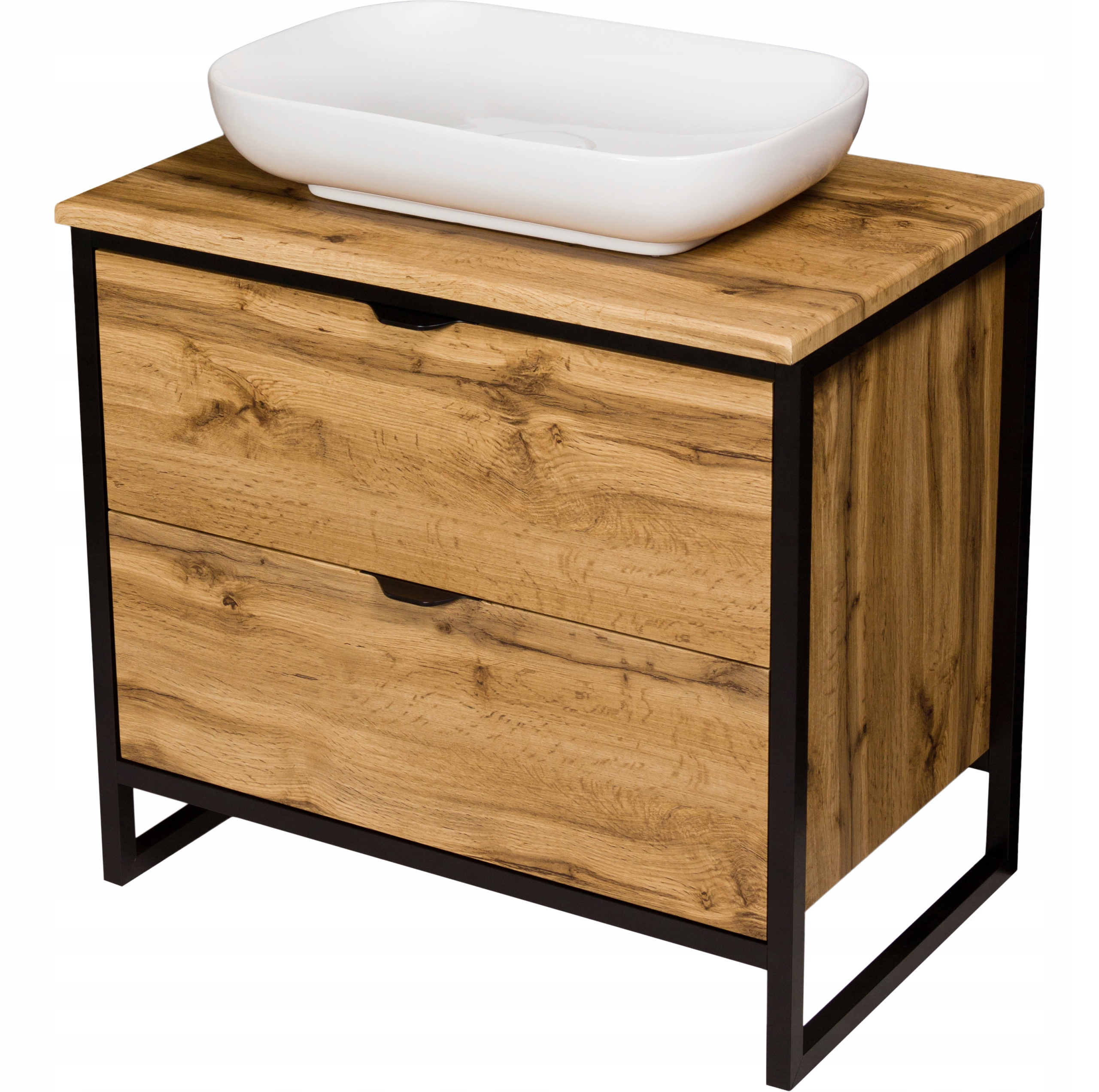 Шафа для ванної в індустріальному стилі лофт із серії NEW YORK. Рама виготовлена з алюмінію з порошковим покриттям чорного матового кольору. Шафа і стільниця кольору натурального дуба. Білий керамічний умивальник PREMIUM 60 в комплекті. Умивальник не має отвору під кран. Шафа оснащена спеціальним сифоном, який дозволяє повністю використовувати верхню шухляду.