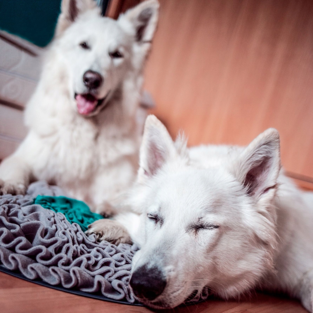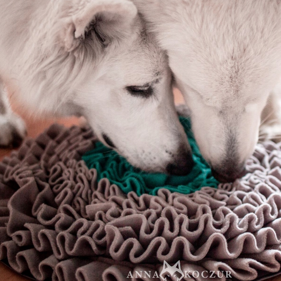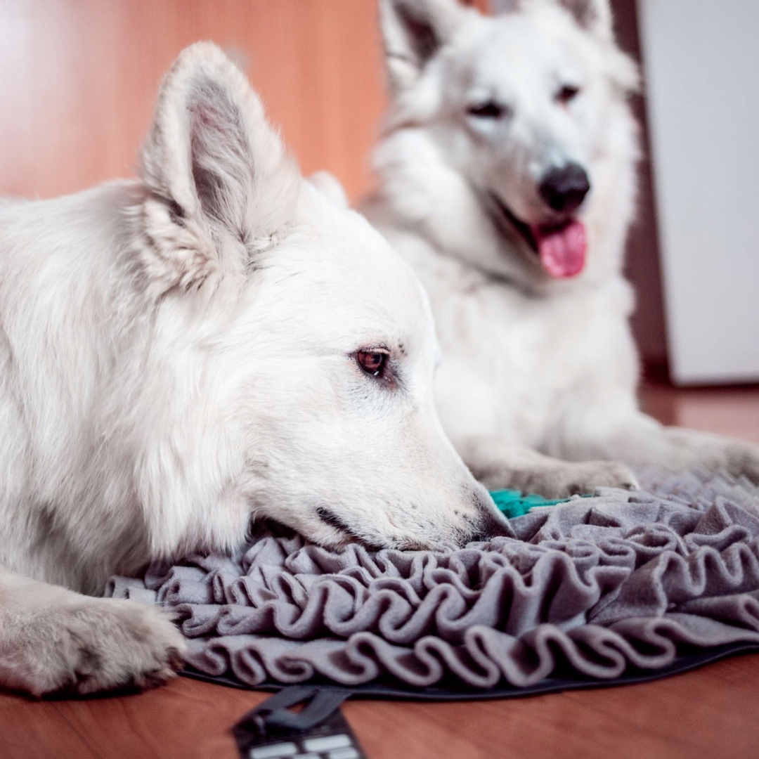 Покладіть килимок із розкиданими на ньому ласощами на підлогу, у місці, куди собака має повний доступ. Нова іграшка, та ще й така ароматна, неодмінно викличе його цікавість. Коли наш улюбленець з’їсть усі закуски, процедуру слід повторити, але кожного разу ми повинні їх ховати трохи більше.