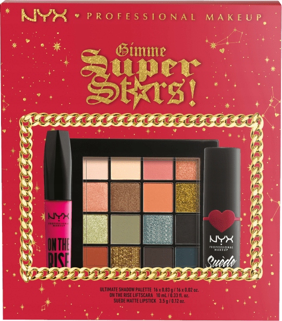 gimmme super Stars! Бренди NYX Professional Makeup. подарунковий набір. Він складається з трьох знакових продуктів бренду: 16 тіней для очей, туш для вій та помади палички. Це дозволить забезпечити ефективний та швидкий макіяж очей для всіх випадків. Крім того, він прекрасно підкреслить губи з інтенсивно червоним відтінком, а також розширить, розгортає та підкреслює вії. Набір був розміщений в атмосферній, святковій упаковці, що робить його ідеальним для подарунка для коханої людини.