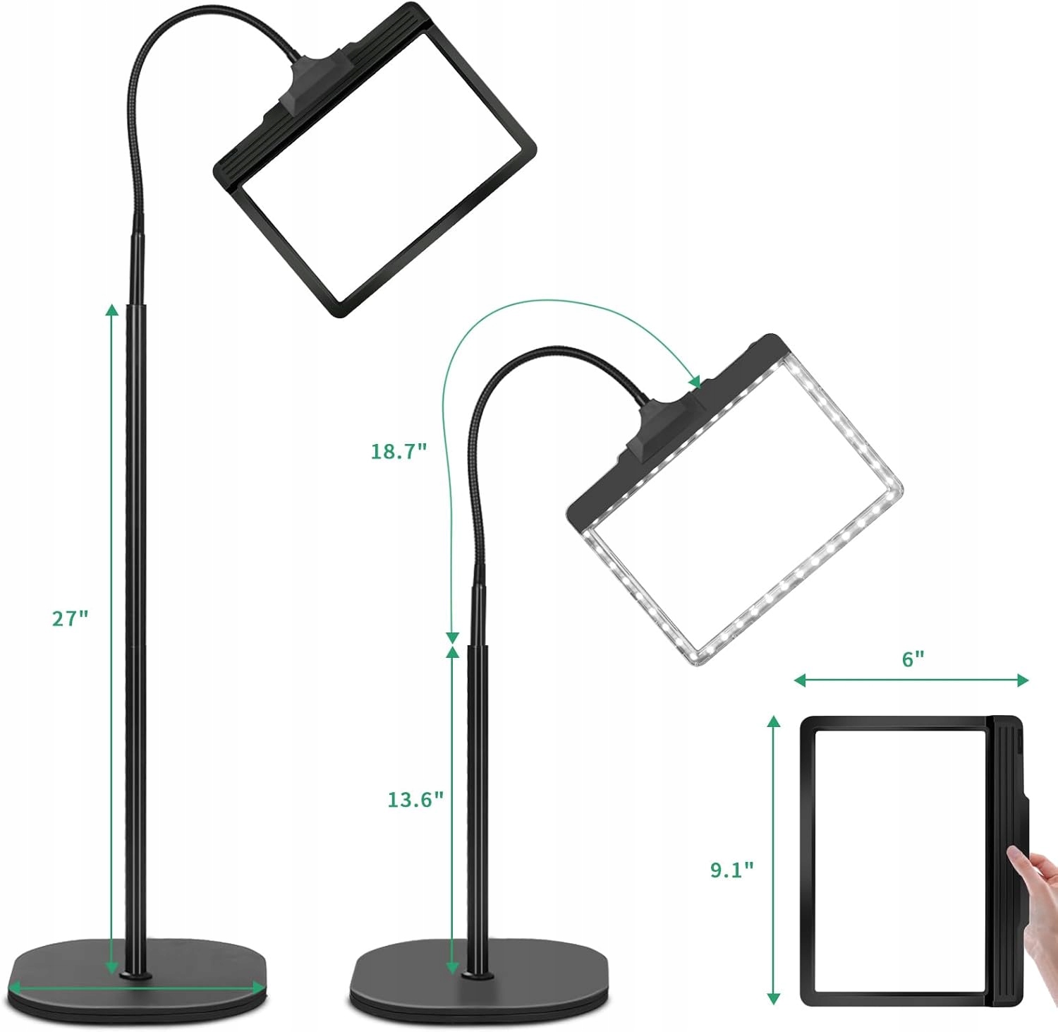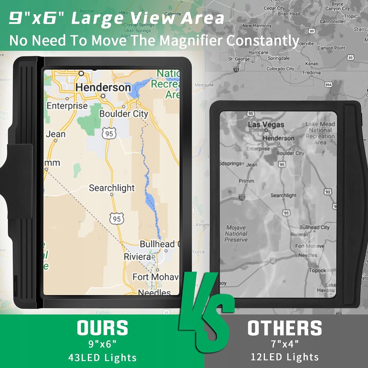 - 【Великий лупа для читання】 Цей великий лупа з освітленням становить 9 х 6 дюймів, забезпечуючи більшу площу зору без необхідності багаторазового руху лупи. 5-кратний масштаб високої роздільної здатності охоплює 500% області без спотворень, що корисно під час читання книг.