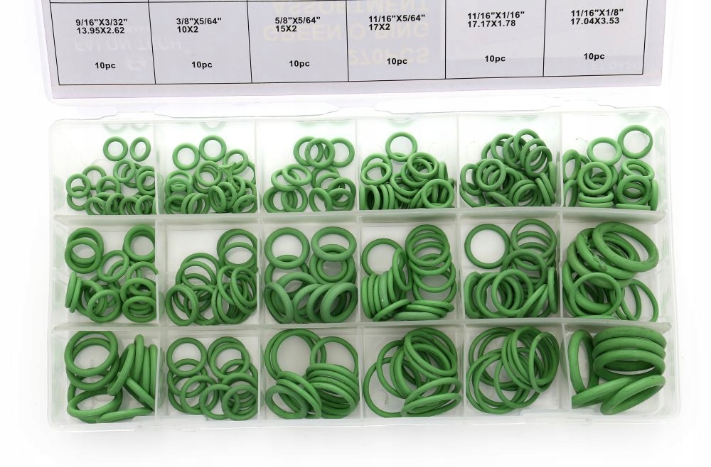 Набір дуже міцних ущільнювальних кілець для кондиціонера, стійких до: озону, дизельного палива, мінеральних масел і мастила, масел рослинного і тваринного походження, легких паливних масел, масляно-водних емульсій, таких як hsa, hsb, аліфатичних вуглеводів такі як: бензин, пропан-бутан, розбавлені кислоти, основи та солі (навіть при підвищених температурах), кислотні гази. суміші гліколів з водою до 150°C.
