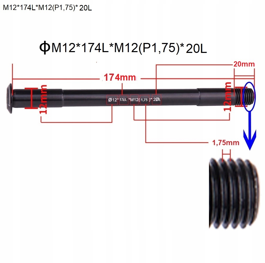 Oś sztywna Thru Axle 174mm M12x1,75, tylna oś.