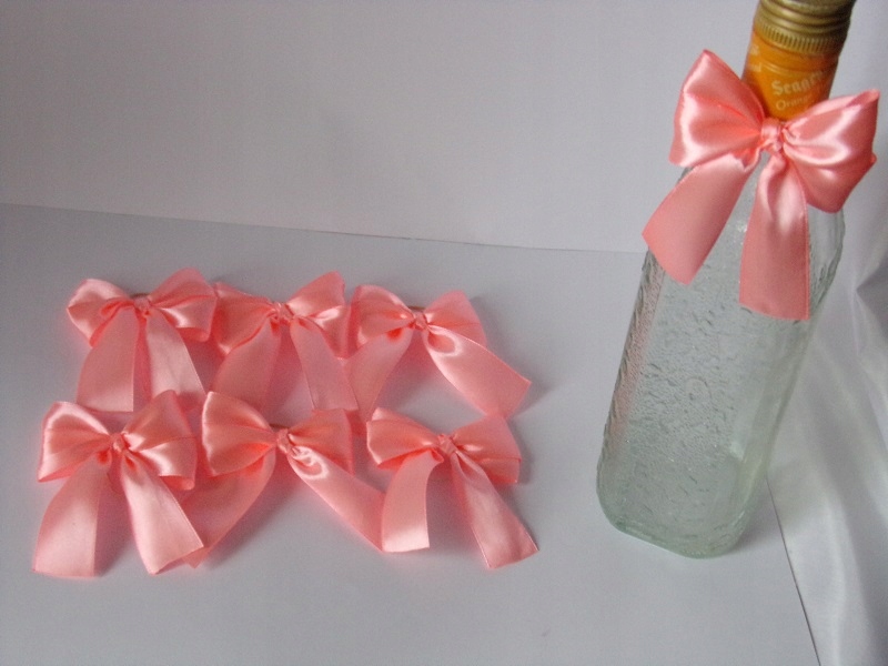 Декори зроблені з атласної стрічки бл. шириною 25 мм і гумкою для кріплення прикраси до пляшки.