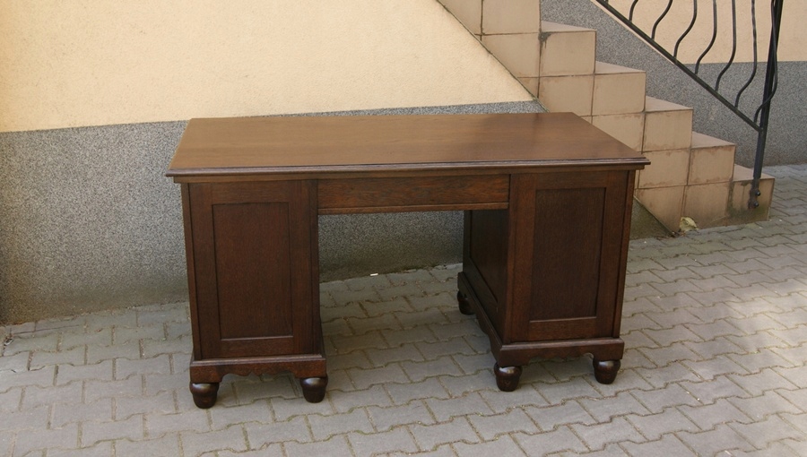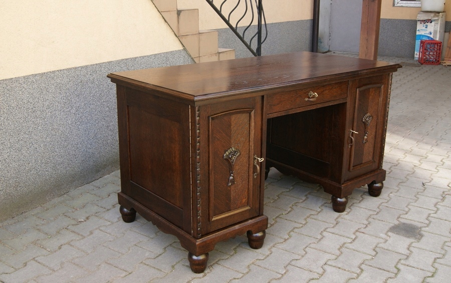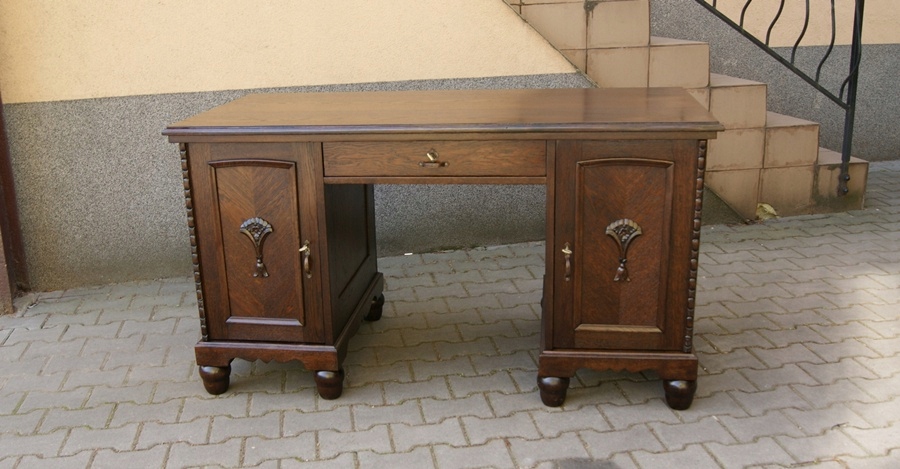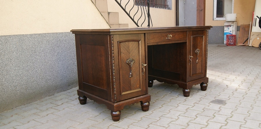Тема сьогоднішнього аукціону - це унікальний стіл з міжвоєнного періоду, виготовленого з дерева в натуральному дубовому шпоні (шпона), щойно завершена в половині. Свіжий та чистий агент, всі ефективні замки, оригінальний стіл -це безкоштовна меблі, яка може стояти в будь -якій точці заданої внутрішньої частини, задня частина закінчена, як ціле.