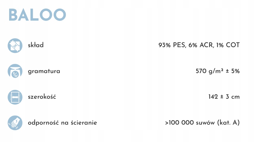 Baloo — це оригінальна благородна колекція, що складається з 20 кольорових версій. При створенні цієї колекції нам вдалося отримати характерну для букле петельчасту поверхню. Все завдяки петельній пряжі, яка вплетена в щільну і міцну основу, непомітну зовні. Завдяки цьому, крім естетичної цінності, тканина набула довговічності, що особливо важливо для оббивників.