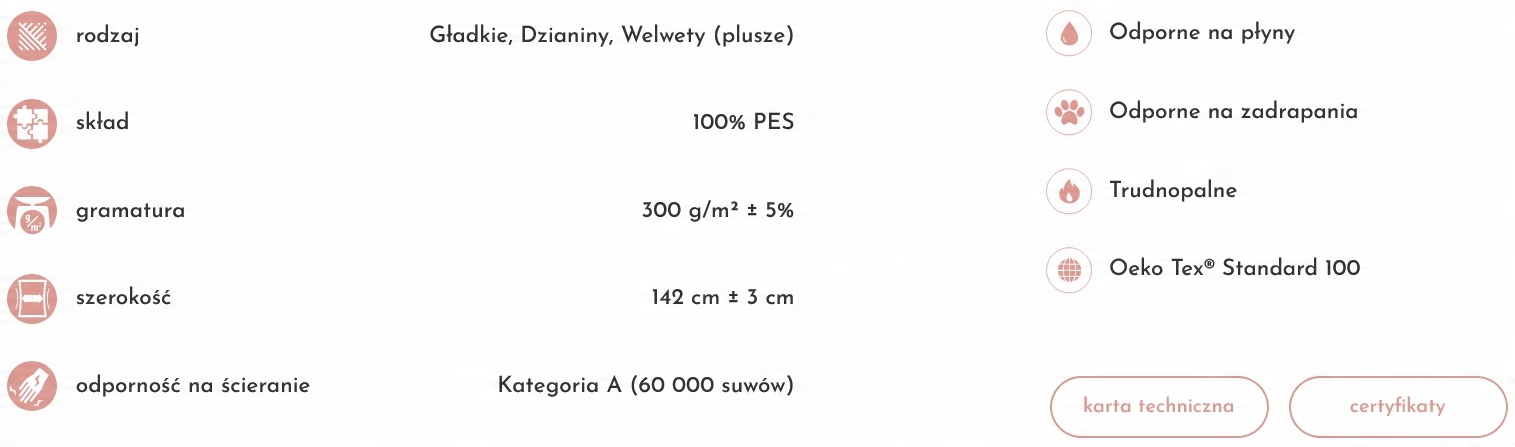 Матеріал отримав дуже високий результат у тесті на стирання - 60 000 циклів. Це дозволяє стверджувати, що він дуже міцний - при його виготовленні використовувалися тільки найякісніші компоненти. Крім того, вона дуже приємна на дотик і надає приємну теплоту інтер'єру.