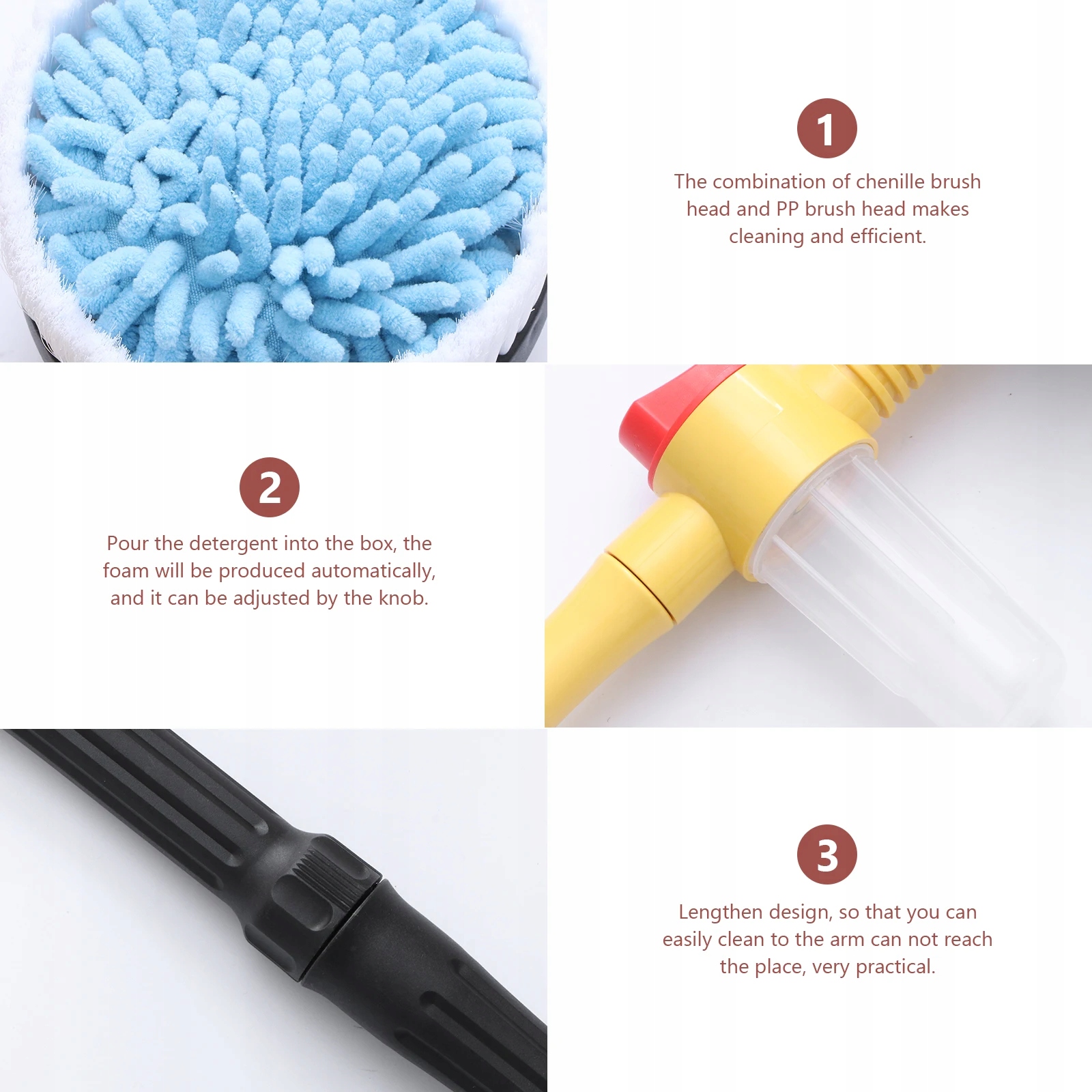 Цей водяний розетка, що автоматично обертається, не вимагає електроенергії. Економить час і енергію. Вода тече в трубу, високий тиск змушує воду штовхати механізм і змушує його працювати автоматично. Обертова швабра в стилі Dwesign і пухка насадка щітки можуть ретельно очистити, особливо сильно вбираючи воду, захищаючи фарбу.