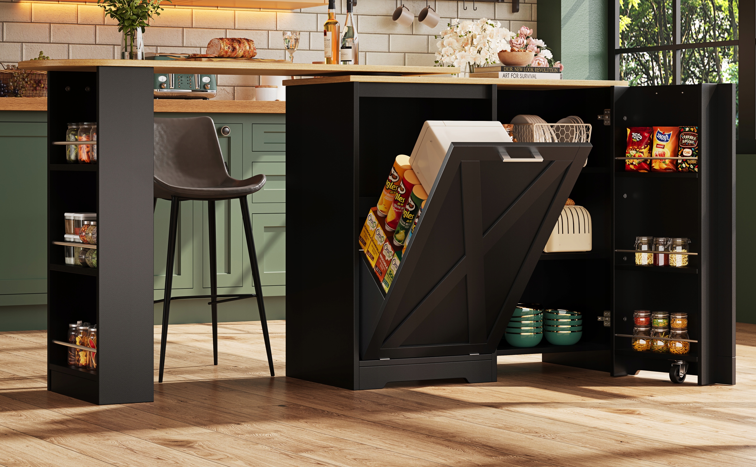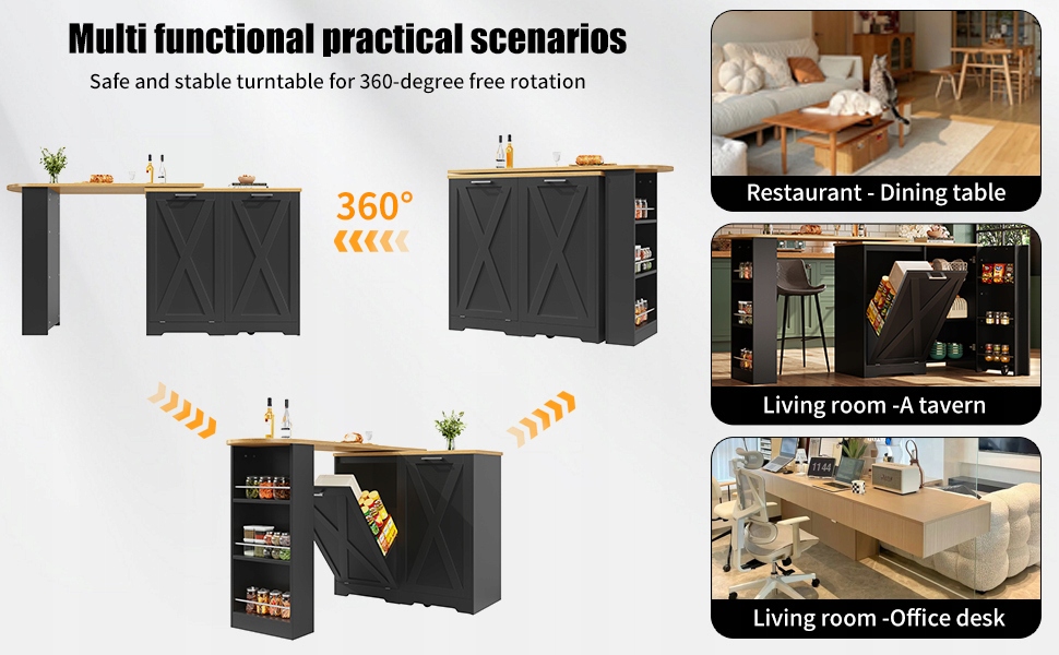 обертовий 360 ° їдальня, простий і сучасний, багатофункціональний зберігання, підходить для спальні, вітальні, їдальні, обертового сервера з бічними поличками, чорними, з нахилами дверей