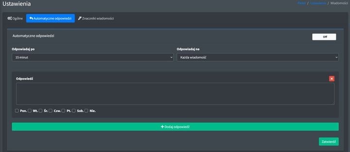 - Відповіді - Автоматично відповіді на повідомлення та обговорення для певного дня тижня та вибраним способом.