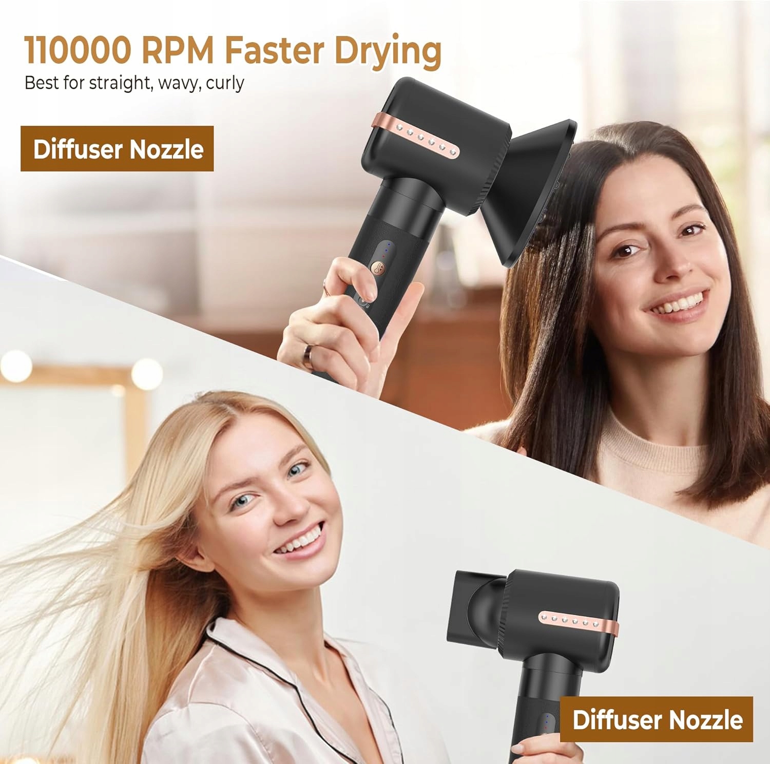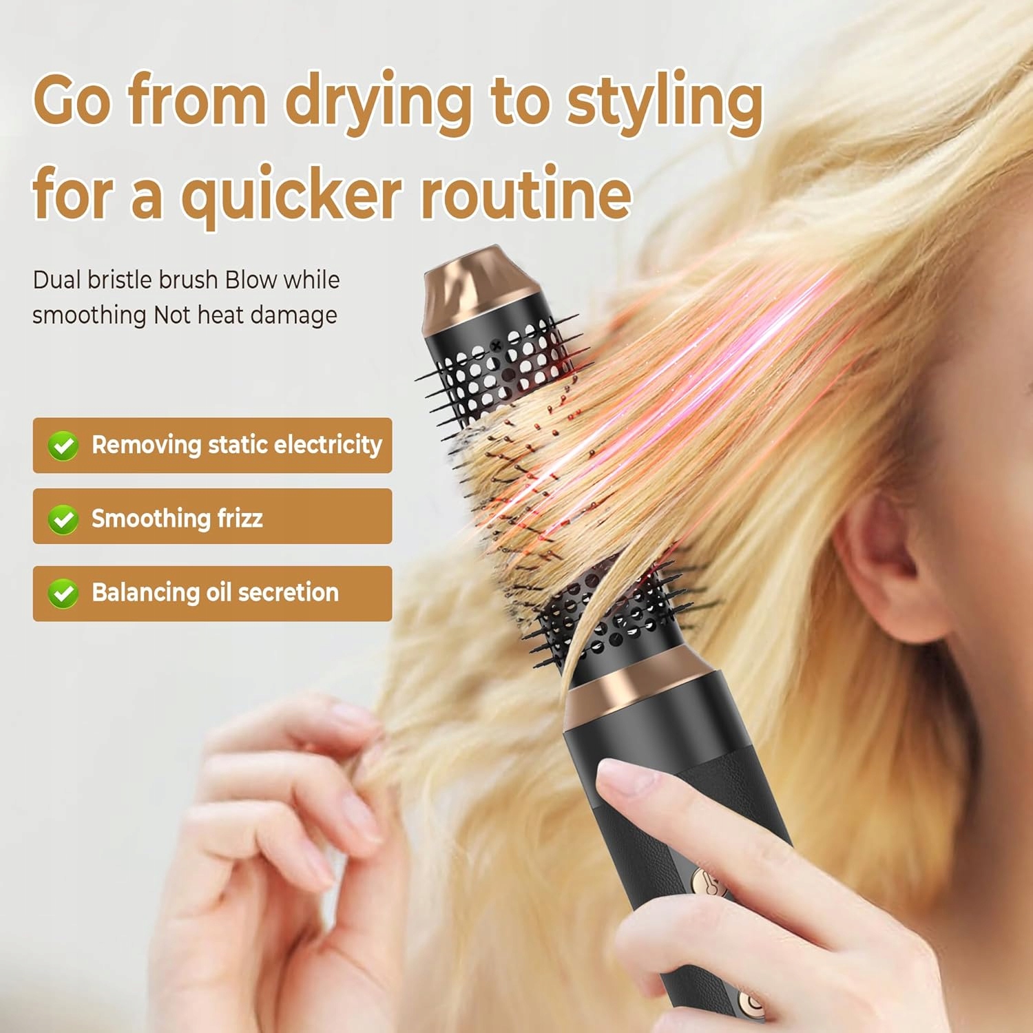 - Швидке висушування волосся -пензлик для волосся з теплим повітрям, розроблений самостійним двигуном до 110 000 об/хв, створює швидкий і сильний повітряний потік зі швидкістю до 20 м/с, що в 6 разів сильніше, ніж у випадку традиційної щітки для волосся з теплим повітрям. Скоротити стилізацію без пошкоджень, спричинених теплом. Інноваційний фен з круглим пензлем забезпечує чудовий досвід під час укладання.