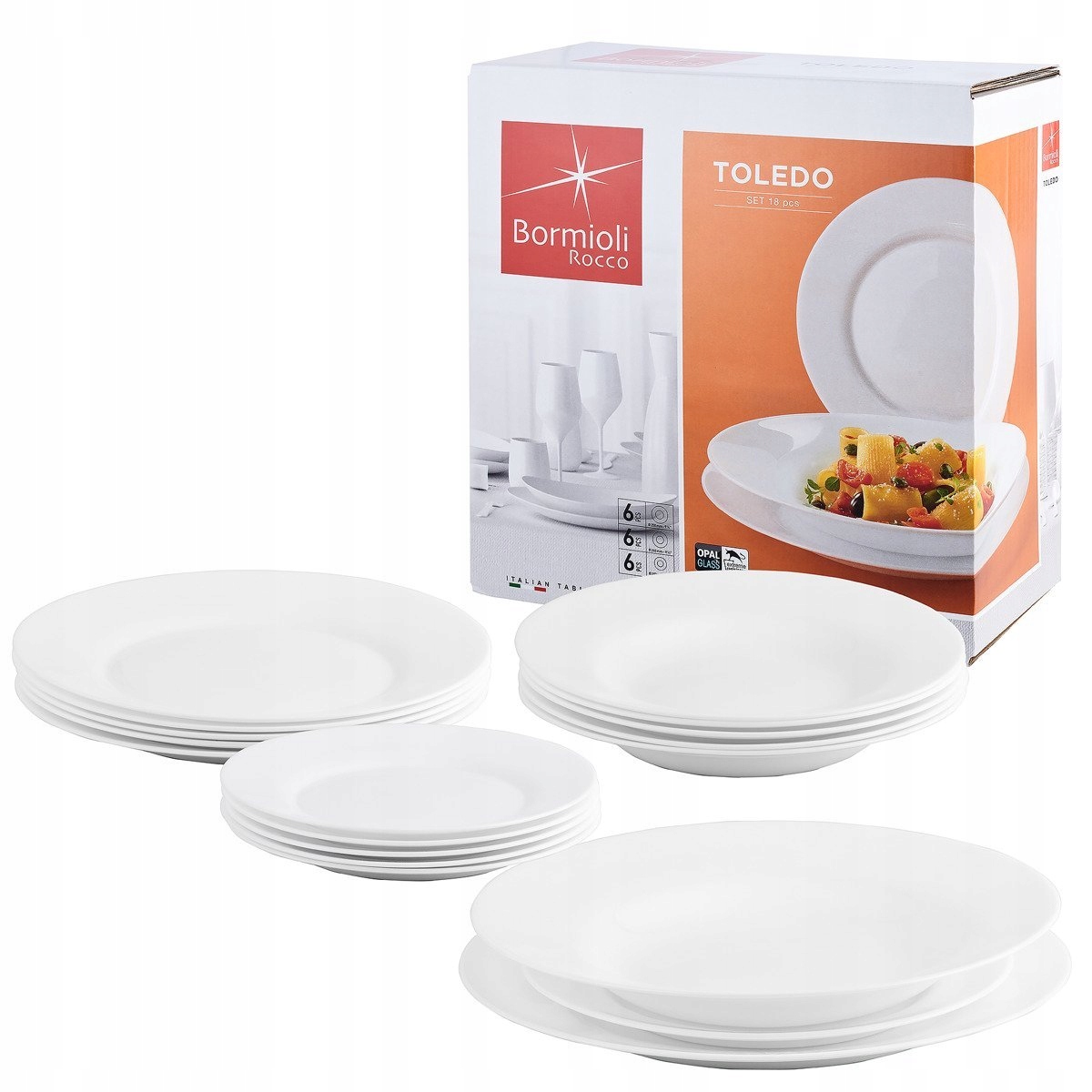 Тарілки Toledo, 18 елементів на 6 осіб Bormioli - апетит до мінімалізму. Тарілки Toledo чудово впишуться в будь-який будинок. Вони підходять до будь-якої композиції, як за кольором, так і за стилем. Це завдяки максимальному мінімалізму, який вони представляють. Перш за все, їх вирізняє позачасовий, бездоганний білий колір. Все це доповнюється класичними формами. Ідеальні овали, з чітко вираженою центральною частиною посудини, забезпечують практичну універсальність. Цей посуд можна використовувати для індивідуальної подачі страв, а також для подачі закусок або тортів. У наборі шість глибоких тарілок, шість плоских тарілок і шість десертних тарілок. Варто відзначити, що вони брендовані відомим італійським брендом Bormioli Rocco.