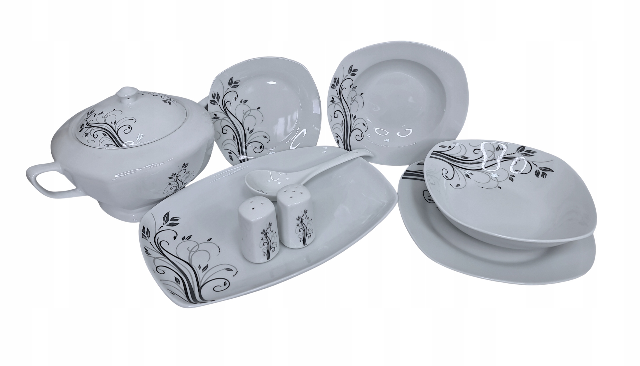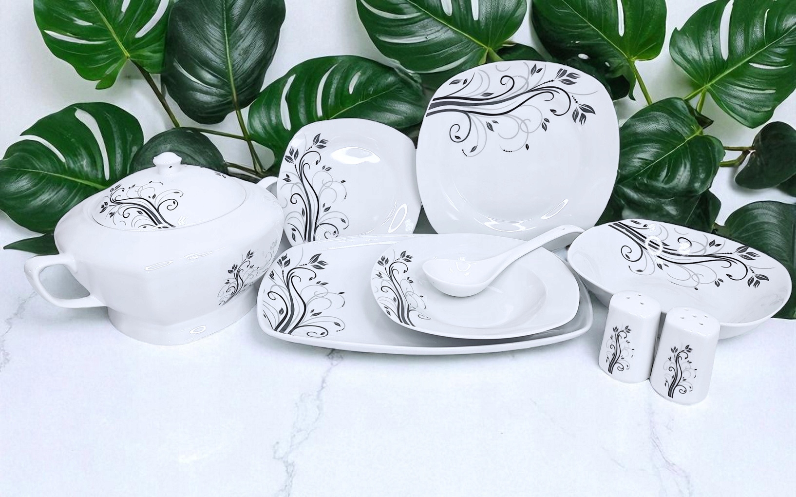 - Комплектність: набір містить усі необхідні елементи для сервірування страв на 12 осіб - від тарілок до аксесуарів, таких як сільничка та перечниця.