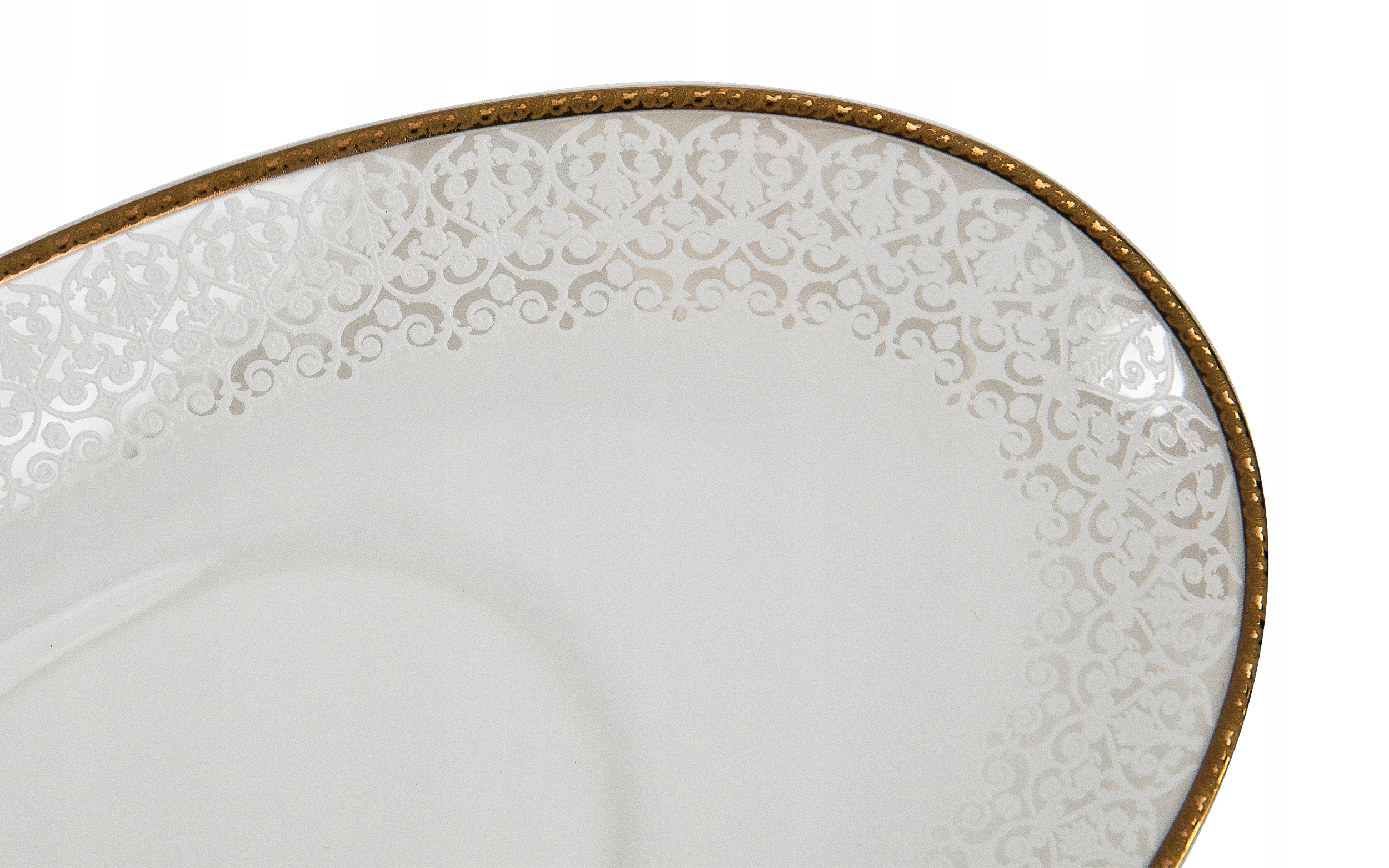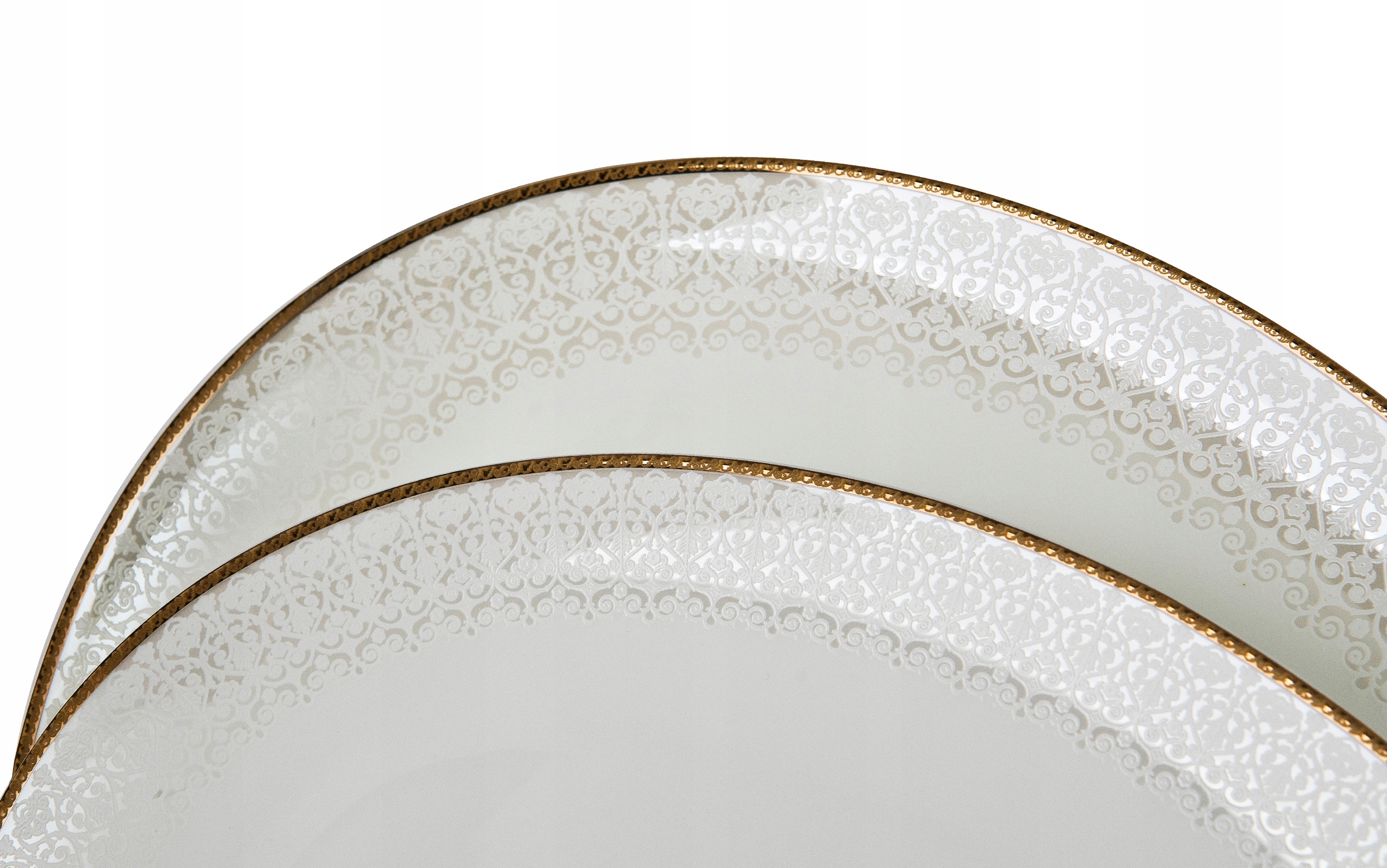Золоті прикраси по краях посуду додають блиск і елегантність порцеляни, а тонка аплікація у вигляді мережива надає їй шарму та чарівності.