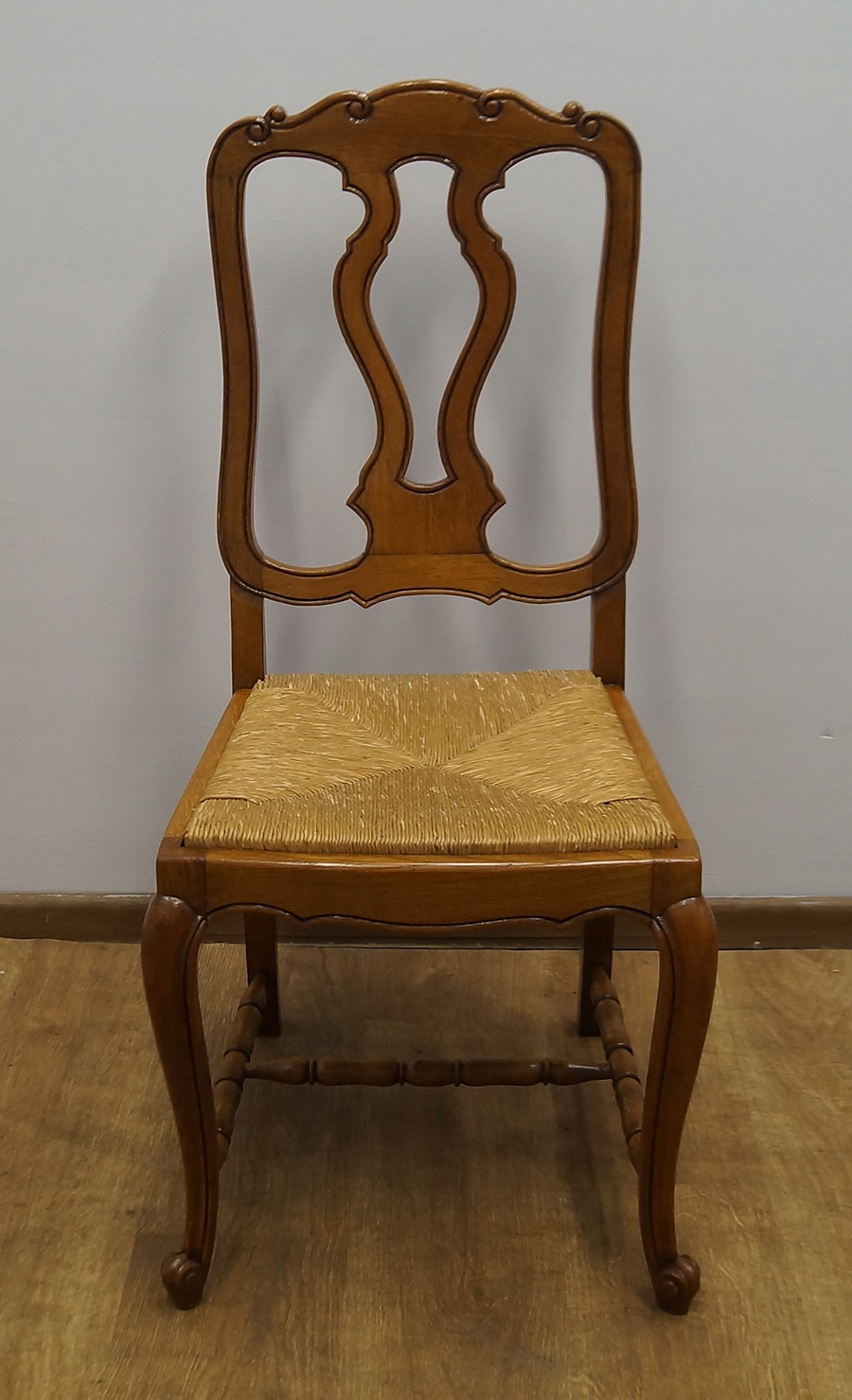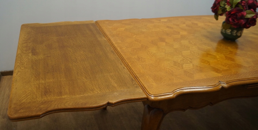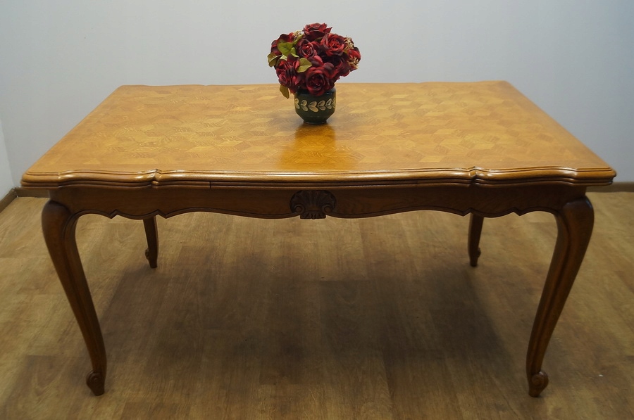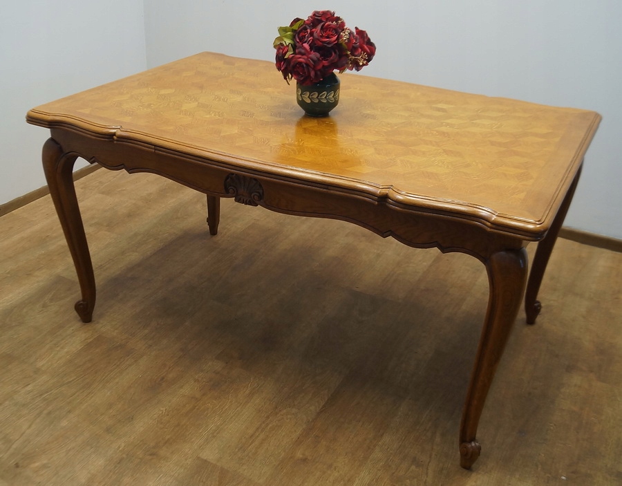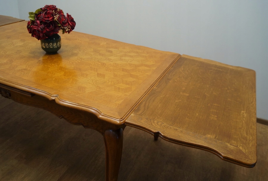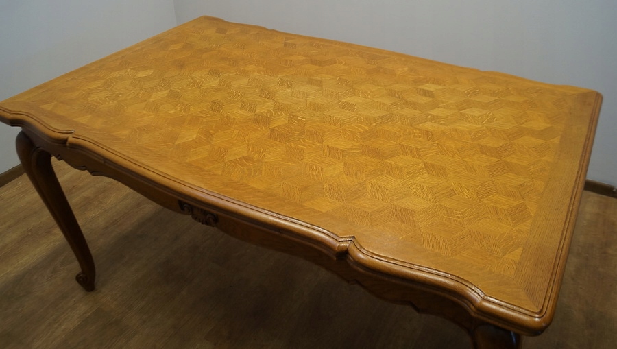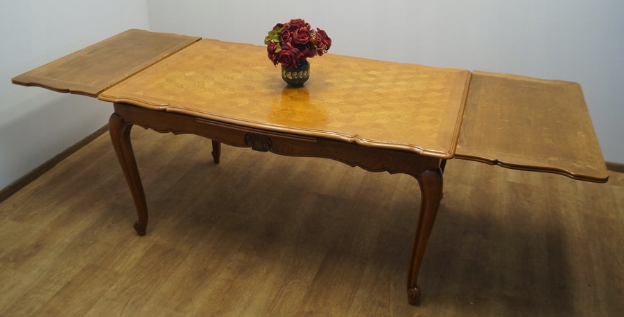 Стіл розсувний, дуже міцний і стійкий, з інкрустованою стільницею. Сидіння обшиті плетеною тростиною, спинки фантастичної форми.