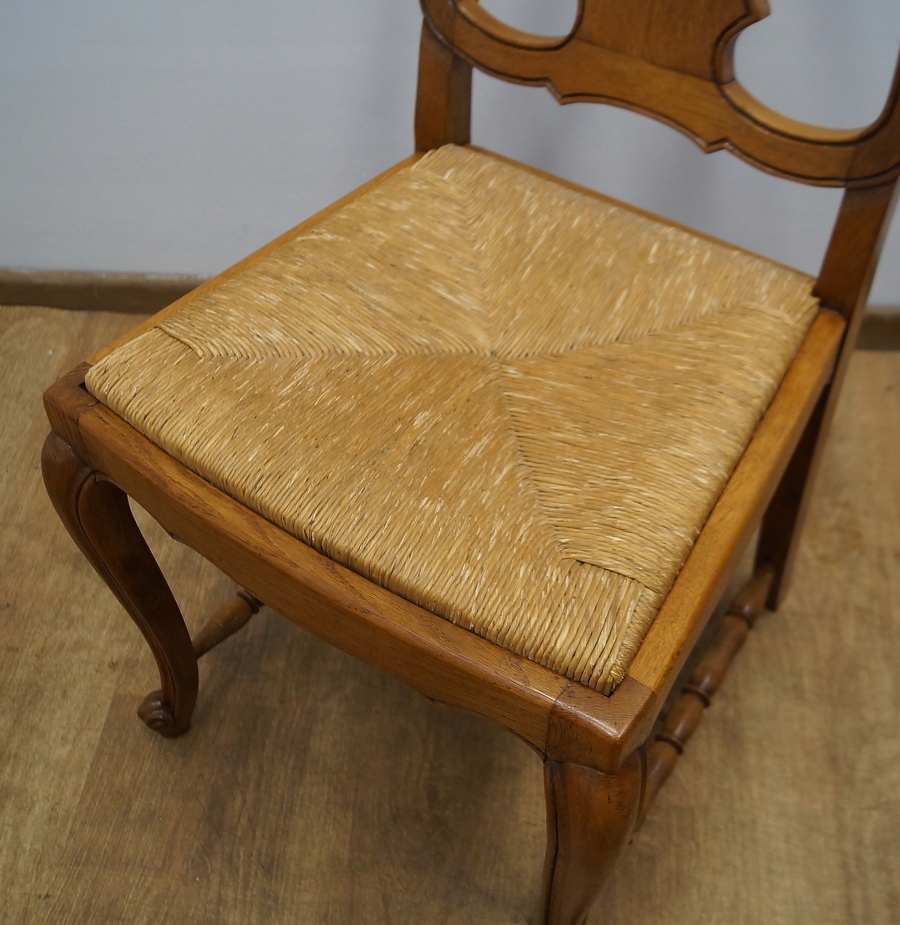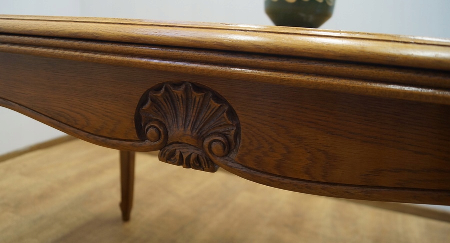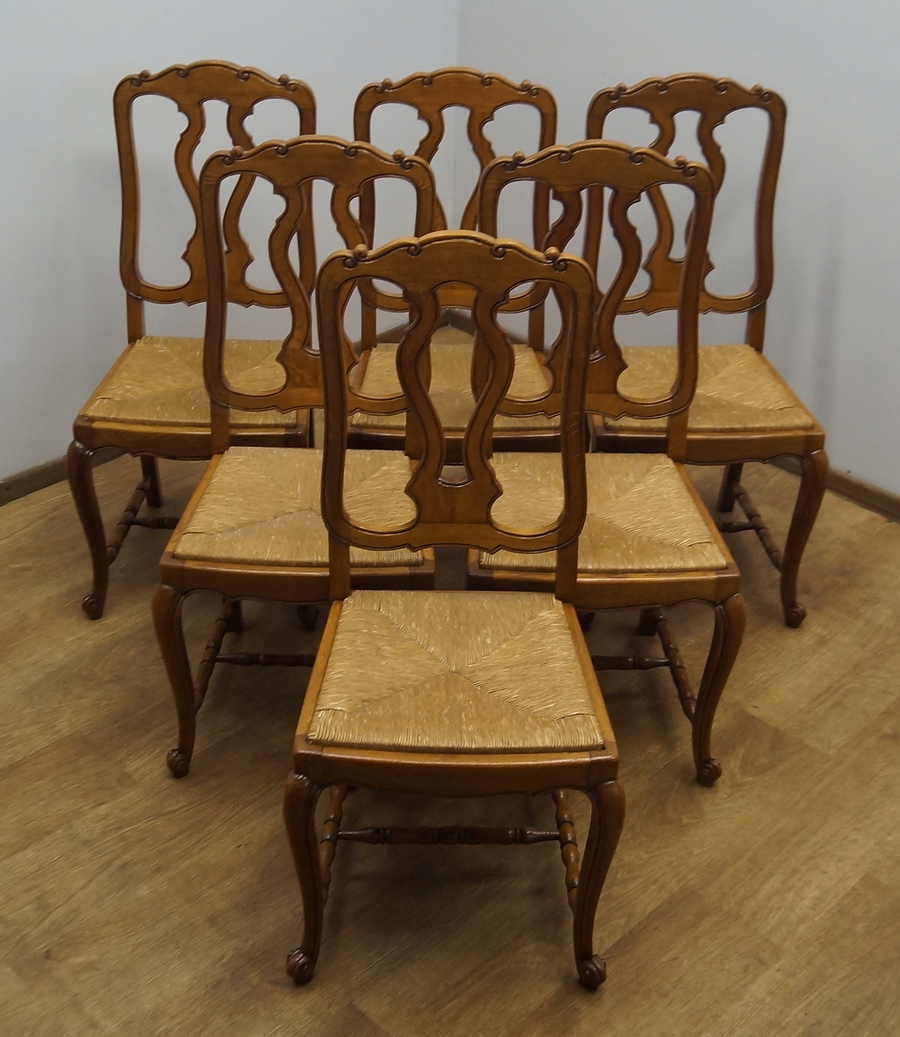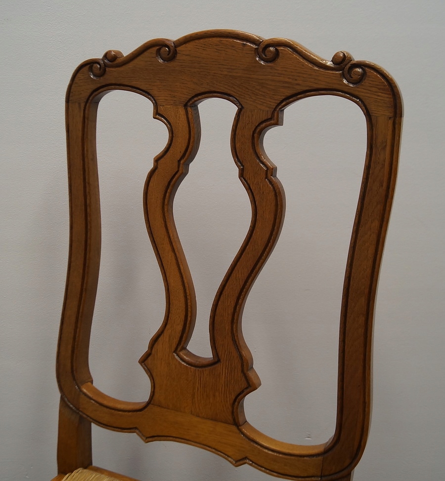 Стіл розсувний, дуже міцний і стійкий, з інкрустованою стільницею. Сидіння обшиті плетеною тростиною, спинки фантастичної форми.