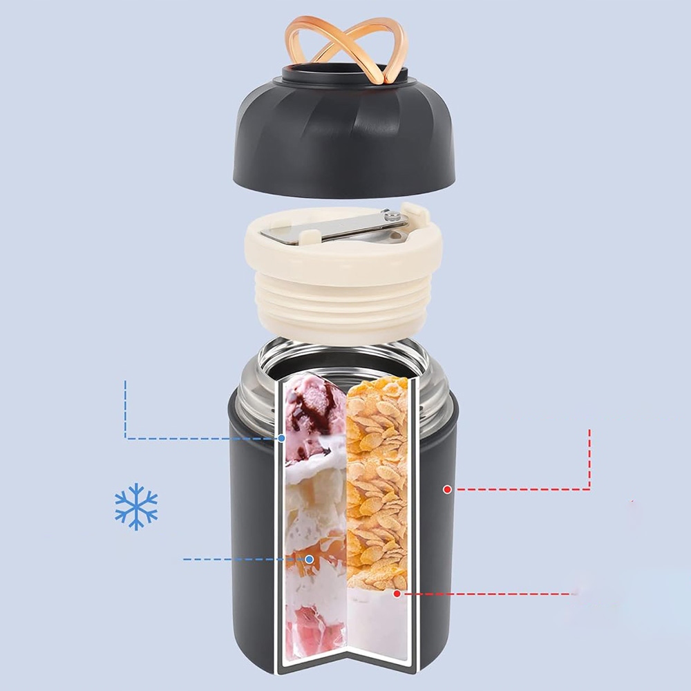 ♨️Вбудована ложка: Цей термос для дітей і дорослих має місткість 550 мл (19 унцій) і складну ложку всередині. Не переживайте, якщо ваша дитина забуде ложку. Гачок полегшує кріплення. Надійно зберігайте наш герметичний харчовий контейнер у сумці для обіду.