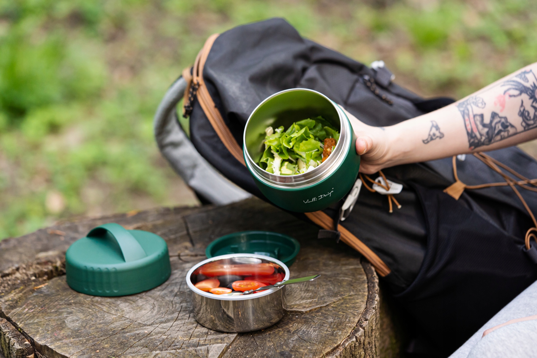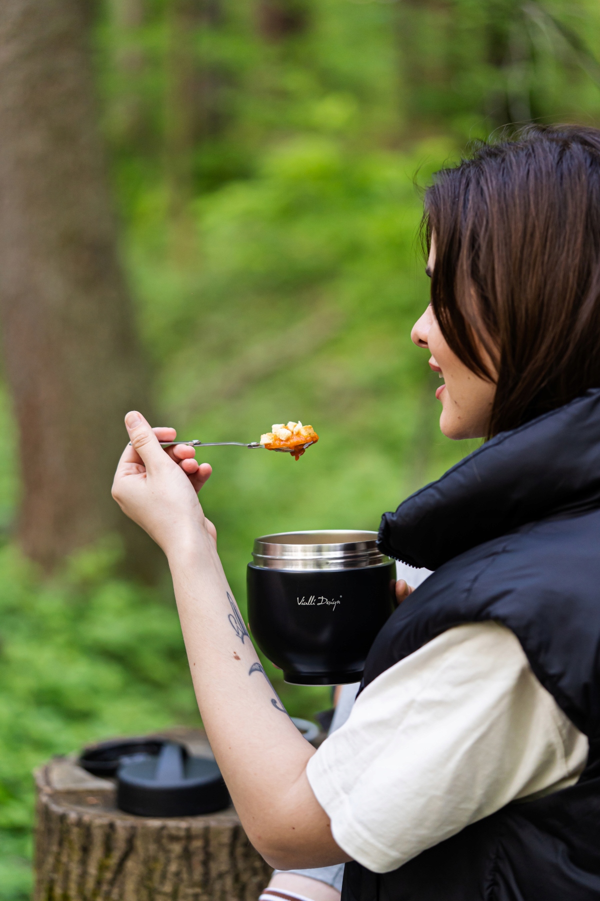 Виріб виконає своє призначення як посудина для гарячих страв - ідеально підходить для супів або кремів. Крім того, великою перевагою термоса є ємність, яка ідеально підходить для розділення добавок до страви, напр. грінки. Над ємністю знаходиться підставка для столових приборів зі складною ложкою. Це рішення означає, що у вас завжди під рукою все необхідне для їжі на природі чи на роботі.