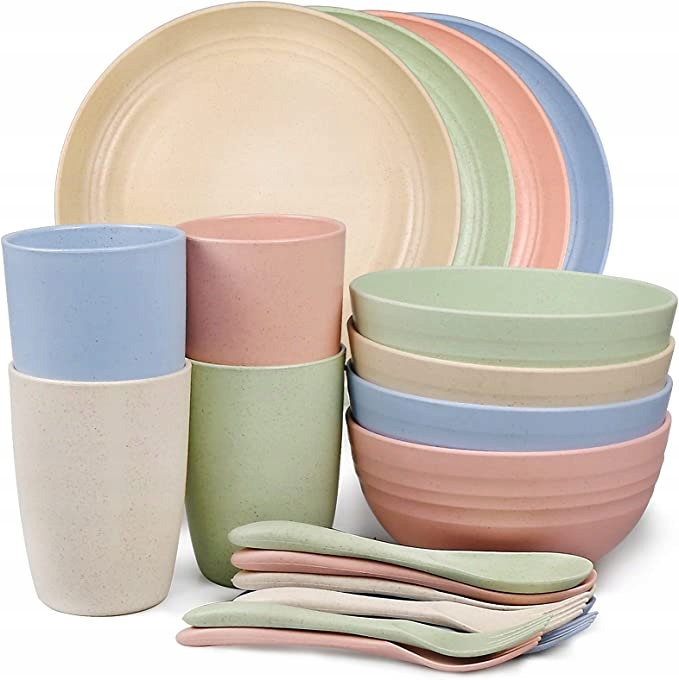1. Зроблено з натуральної пшениці, нетоксичні речовини. Порівняно з традиційним посудом, які є більш важкими та легко розбиваються, ці вечері, виготовлені з пшеничної соломи, не є. 4-кольорова конструкція забезпечує приємний настрій під час їжі, а не лише нудних, рівномірних кольорів. Безпечний для використання в мікрохвильовій печі, посудомийній машині та морозильній камері. Ви можете скластись, не займаючи багато місця. Тарілки, чашки та миски можна легко розташувати один на одного. Легкий, зручний для видалення, наприклад, для кемпінгу.