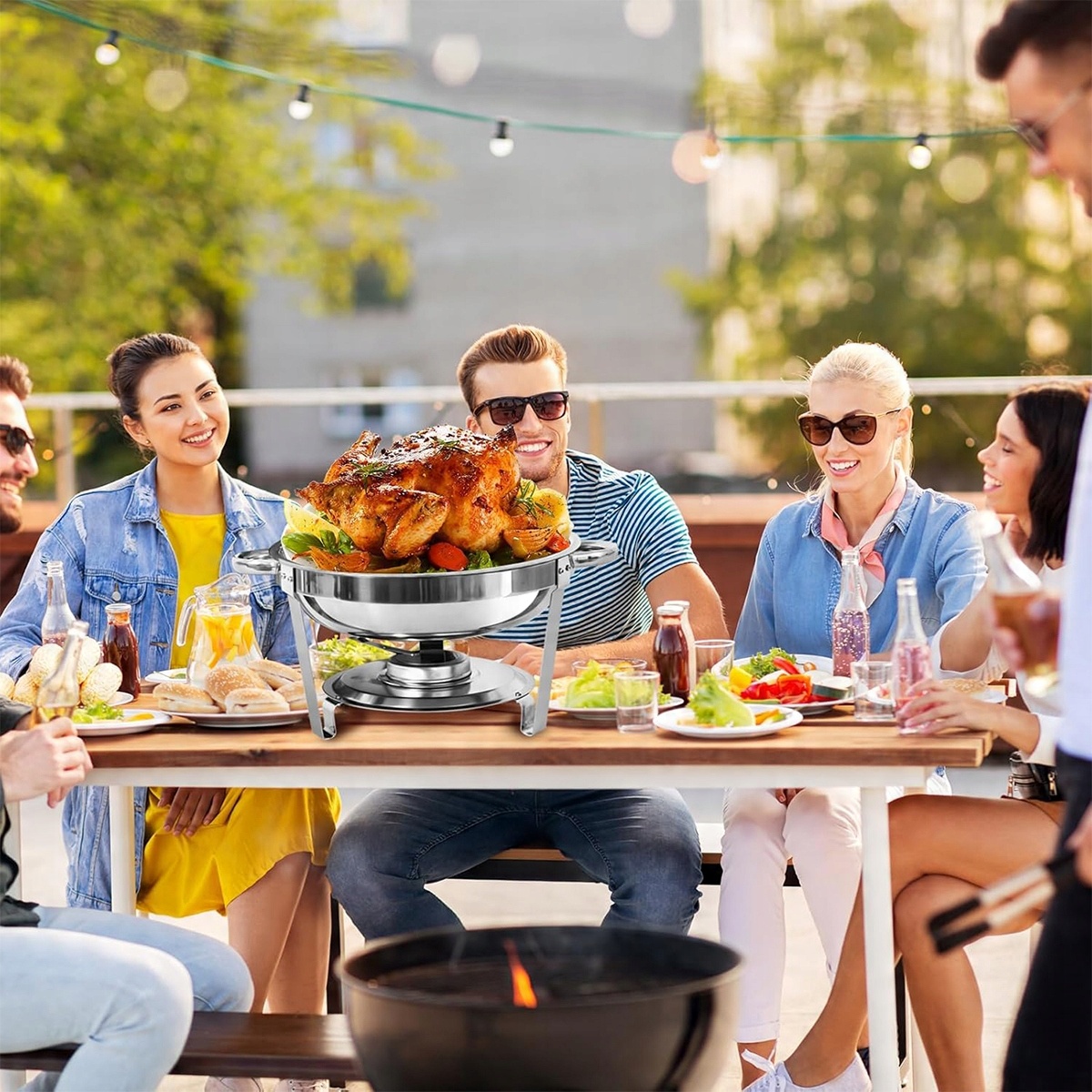 Їжа тарілка містить до 5 літрів вареної їжі, в той час як BEMAR потужністю 6 л забезпечує безпечне обслуговування миски з їжею, гарантуючи навіть розподіл тепла після наповнення гарячою водою. Вигнуті кришки зупиняють тепло, захищаючи температуру та свіжість посуду, тоді як інтегровані ручки полегшують перенесення суден. Матеріал з нержавіючої сталі, затверджений для контакту з гарантіями харчових продуктів.