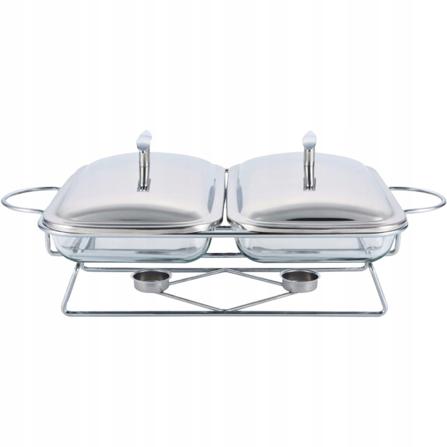 -2 скляні посудини ємністю 2 літри кожна, -хромована рамка для підігріву чайних свічок, -2 кришки з нержавіючої сталі з ручками