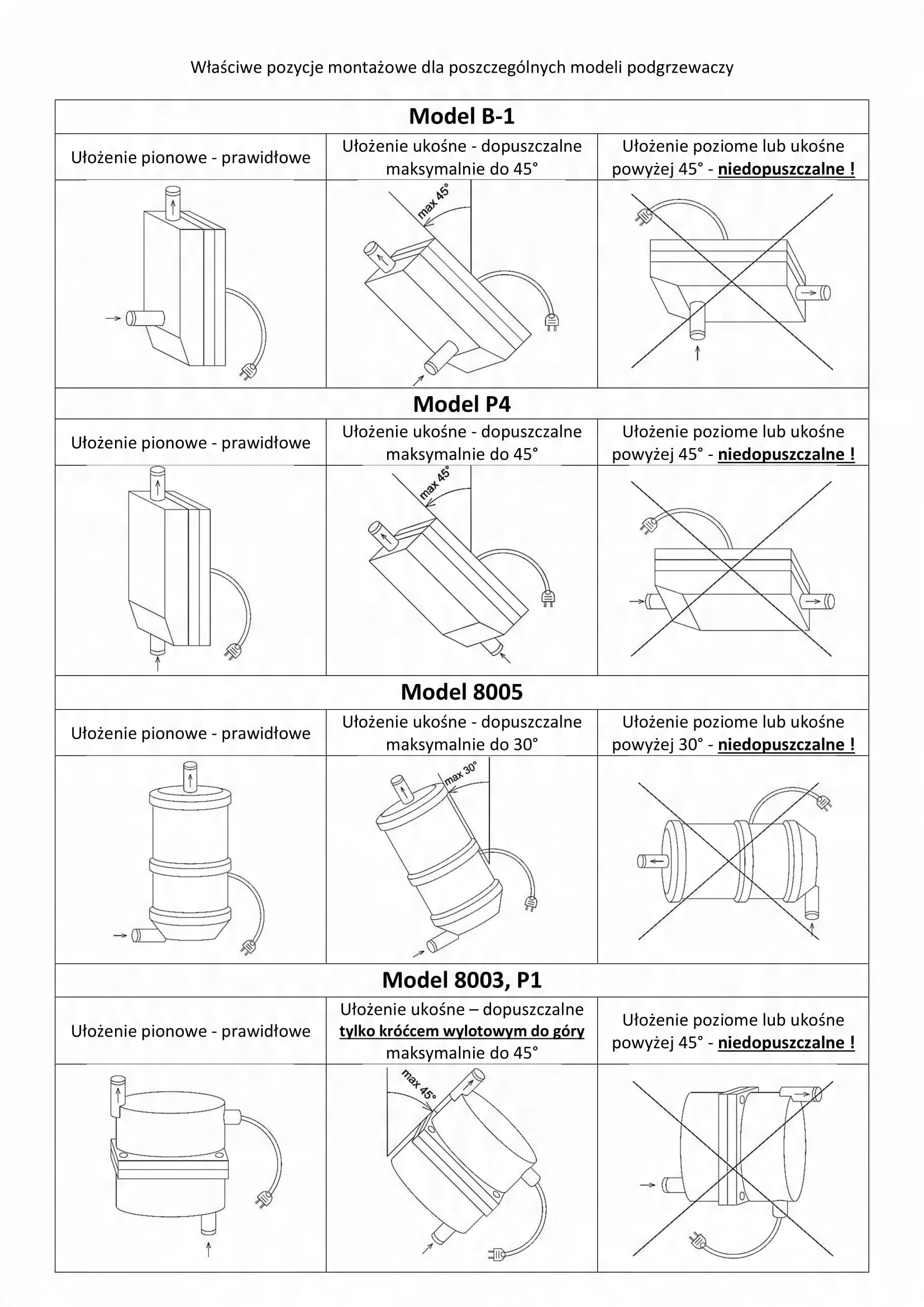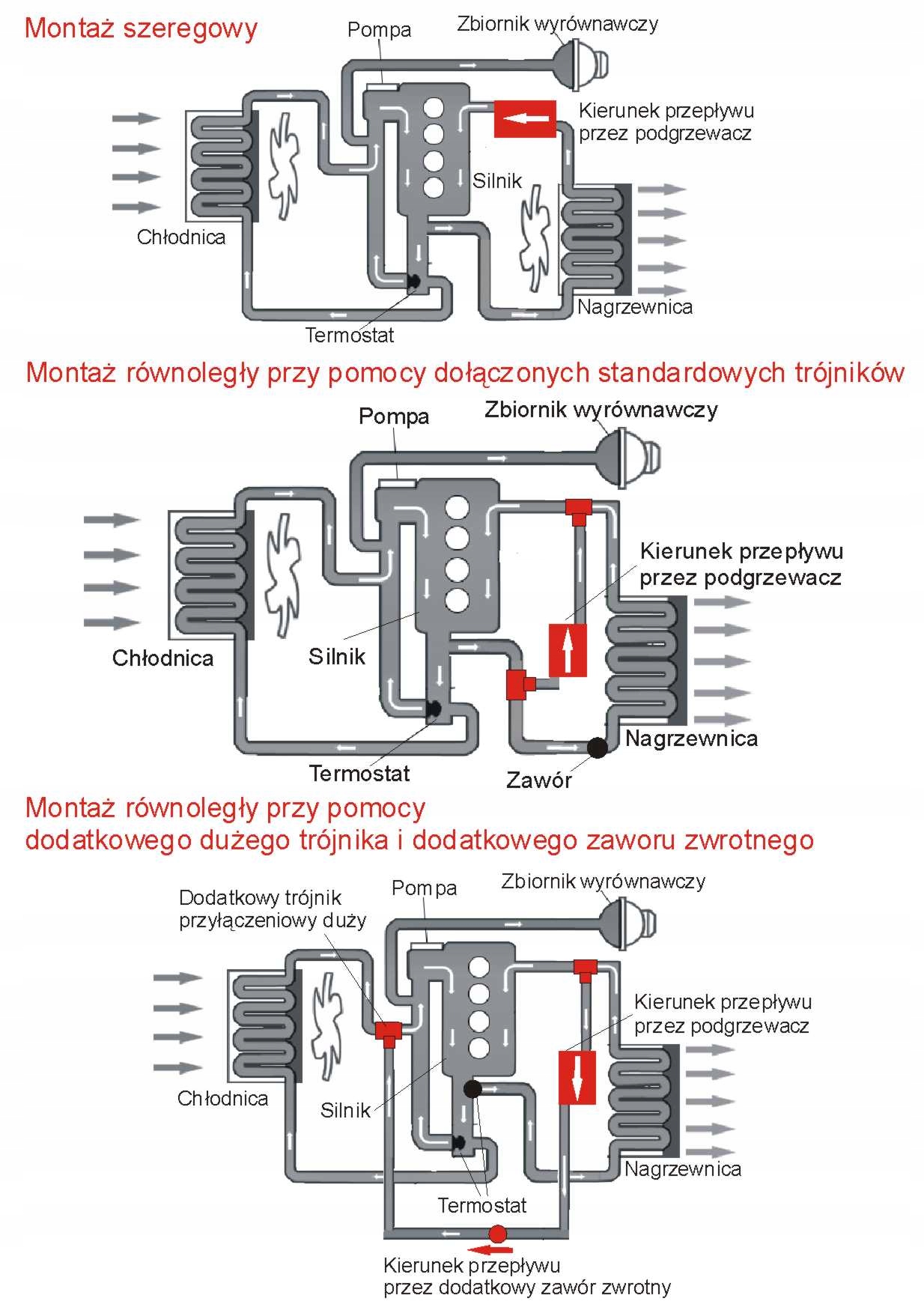 Нагрівач слід підключати послідовно або паралельно (за допомогою трійників, що входять у комплект) до труби нагрівача або іншої короткозамкнутої труби в двигуні таким чином, щоб напрямок потоку рідини, позначений на нагрівачі, був спрямований на двигун. На малюнку нижче показано можливі способи і місця включення обігрівача. Паралельна установка з використанням трійників, що входять в комплект, необхідна, якщо в нашому транспортному засобі немає вільного потоку через так звану малу циркуляцію (двигун - обігрівач). Завдяки трійникам можна обійти обігрівачі і можливі перешкоди. Односторонній клапан і великий трійник, що пропонуються окремо, дають можливість паралельного встановлення між так званим «малим і великим» контуром охолодження (малий контур – нагрівач двигуна, великий контур – радіатор двигуна). Основна вимога при установці - встановити нагрівач нижче верхнього рівня рідини в системі охолодження і забезпечити вільний протікання через систему охолодження.