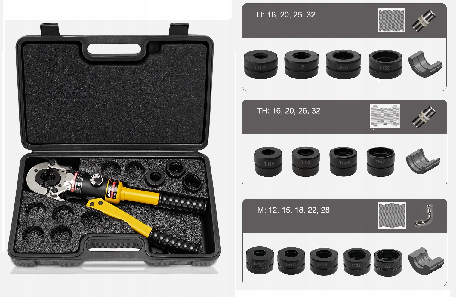- Включено розміри каменю: M12 мм, M15 мм, M18 мм, M22 мм, M28 мм, U16 мм, U20 мм, U25 мм, U32 мм, TH16 мм, TH20 мм, TH26 мм, TH32 мм.