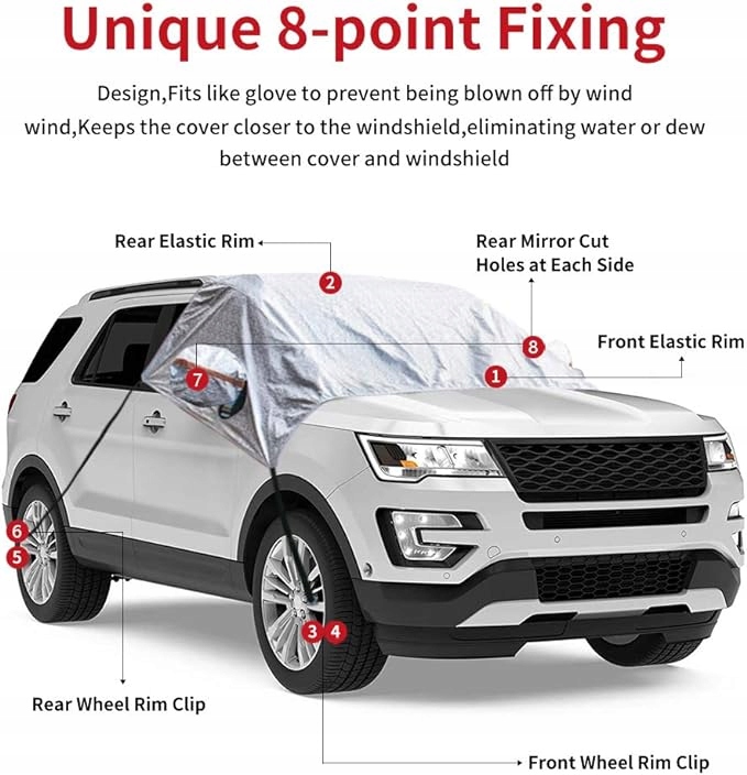 - ✅ Розмір: підходить для більшості позашляховиків, вантажівок. Загальний розмір снігового покриву лобового скла становить близько 152 х 229 см, що забезпечує більшу гнучкість та сумісність, ніж інші снігові обкладинки. Достатня обкладинка захищає переднє вікно і навіть переднє вікно більшості транспортних засобів.