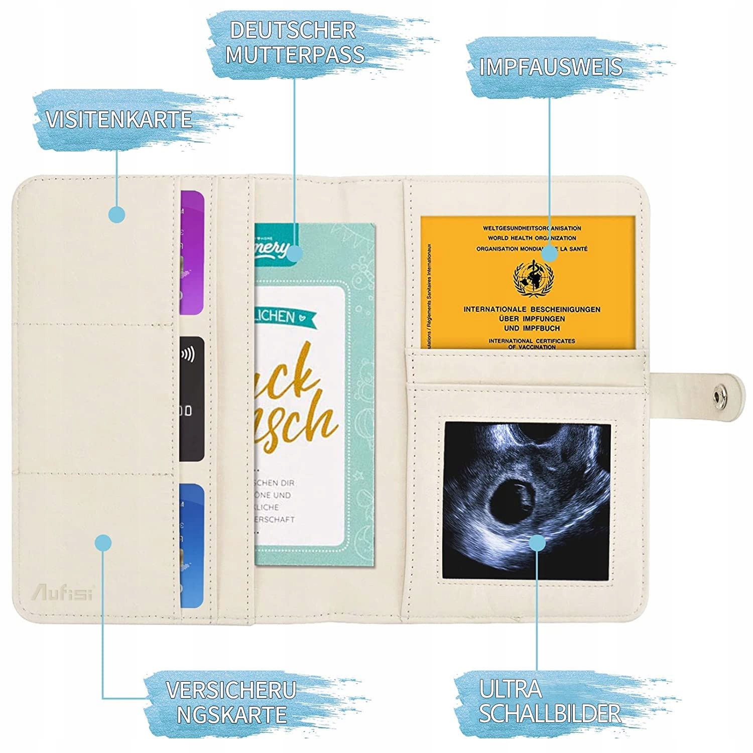 - Обкладинка для паспорта для вагітних має 8 відділень для зберігання всіх ваших документів, таких як фотографії ультразвуку, рецепти, зошити, паспорт для вагітних, картка медичного страхування, посвідчення особи тощо.