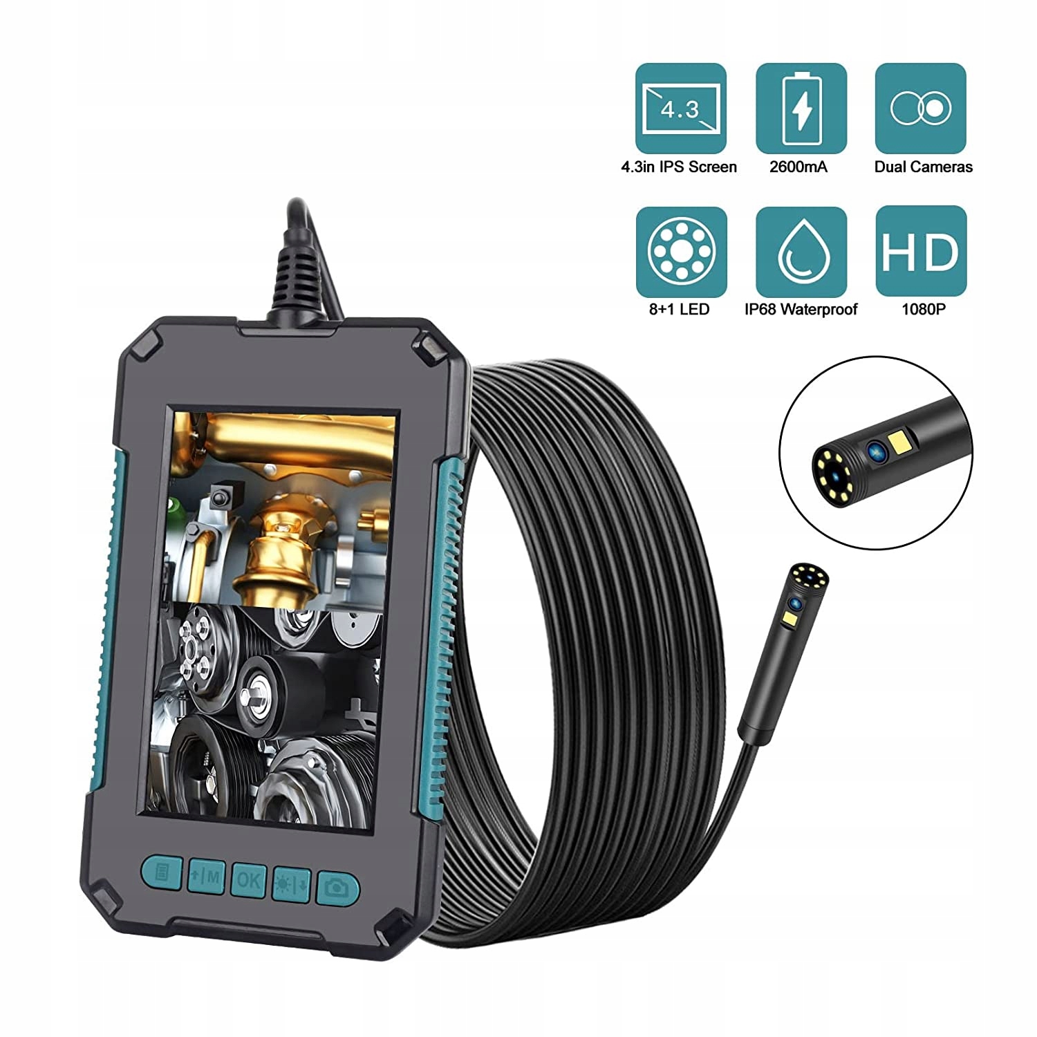 ЗІ СВІТЛОДІОДНИМ ПІДСВІЧУВАННЯМ Камера ендоскопа оснащена 8 світлодіодними лампами, яскравість яких можна регулювати відповідно до ситуації, її можна використовувати в темному середовищі. З АКУМУЛЯТОРОМ Ендоскоп має вбудований акумулятор ємністю 2600 мАг, який вистачає на 57 годин, і поставляється з кабелем для заряджання для зручного використання поза приміщенням. РІЗНІ ЗАСТОСУВАННЯ Широко використовуються для випробування автомобілів, механічного обслуговування, тестування побутової техніки, обслуговування будинку, тестування конструкції стін та в інших сферах. IPS-ЕКРАН Використання оновленого 43-дюймового IPS-екрану 1080P із високою роздільною здатністю, більш яскравими кольорами та чіткішим і природнішим зображенням. ОБ’ЄКТИВ ТА КАБЕЛЬ Оснащений 8-мм об’єктивом, він може виявляти вузькі ділянки, а кабель додається, щоб легко згинати та підтримувати форму відповідно до різноманітних потреб.