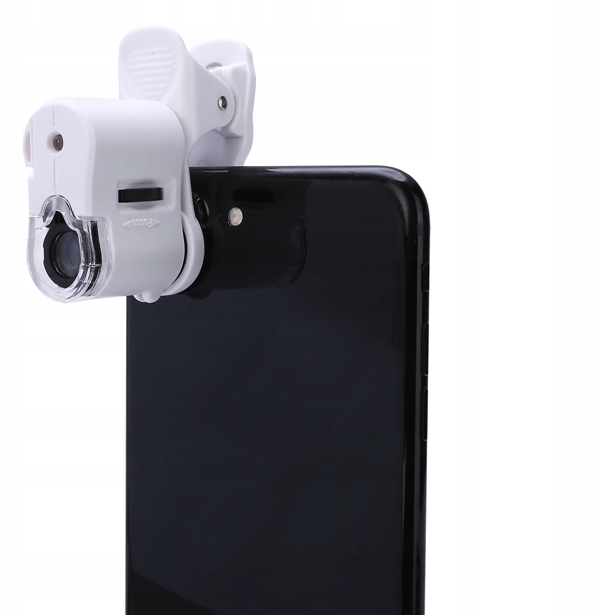 Універсальний білий об’єктив для телефону оснащено монтажним затискачем, що дозволяє дуже швидко збирати та розбирати.
