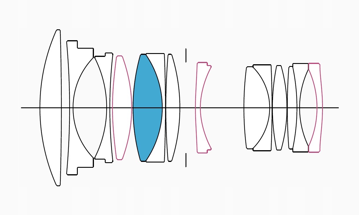 - Конструкція: 11 груп, 14 елементів (1 лінза SLD і 3 асферичні лінзи)