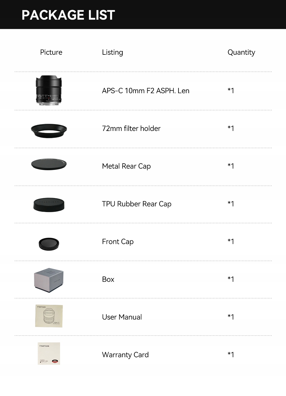TTArtisan 10mm F2 має вбудований сонцезахисний козирок у формі тюльпана, оснащений м'якою передньою кришкою. Оскільки жоден фільтр не можна прикріпити безпосередньо до об’єктива, у комплект поставки входить додаткова бленда, яка дозволяє прикріпити фільтри діаметром 72 мм. Для зручності людей, які регулярно користуються фільтрами, в комплект також входить металевий ковпачок, який прикручується до цього додаткового сонцезахисного козирка. TTArtisan 10mm F2 доступний у байонетох Canon RF, Fujifilm X, micro43, Nikon Z і Sony E.
