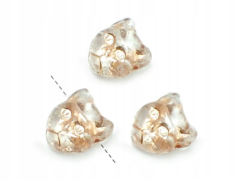 Чеські скляні намистини високої якості у формі голови кота, двосторонні (морда кота по обидва боки бусинки), діаметр близько 12 мм. Поперек бусини, під вухами, проходить отвір діаметром приблизно 1 мм (на фото його хід позначено пунктирною лінією). Кришталь з деталями мідного кольору.