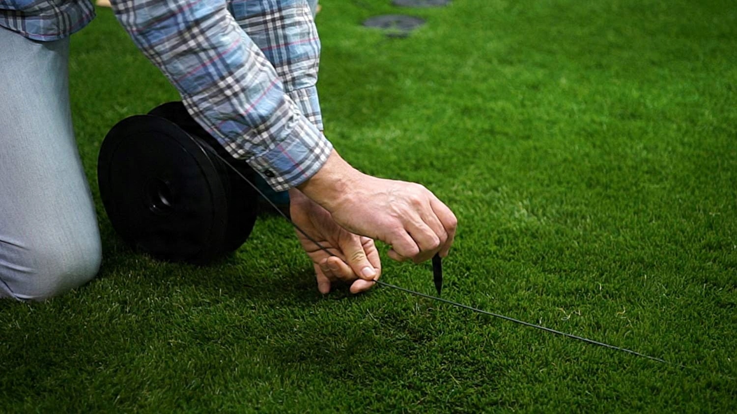 Для кріплення кабелю до газону використовуються спеціальні шпильки з високоякісного атмосферостійкого пластику. Завдяки використанню штифтів кабель міцно прикріплений до землі, він не піддається випадковому перерізанню косаркою, а випромінюваний сигнал не порушується.